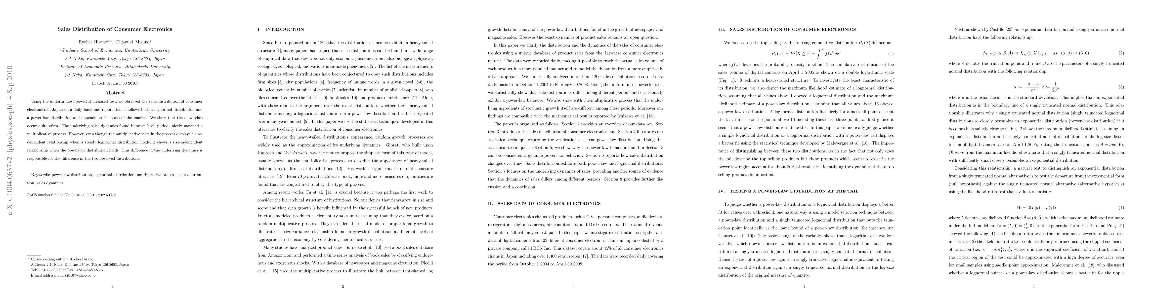 This study employs a uniform most powerful unbiased test to analyze the daily sales distribution of consumer electronics in Japan, revealing a switch between lognormal and power-law distributions contingent on market conditions. The underlying sales dynamics exhibit a multiplicative process, with size-dependent multiplicative terms during lognormal periods and size-independent terms during power-law periods.