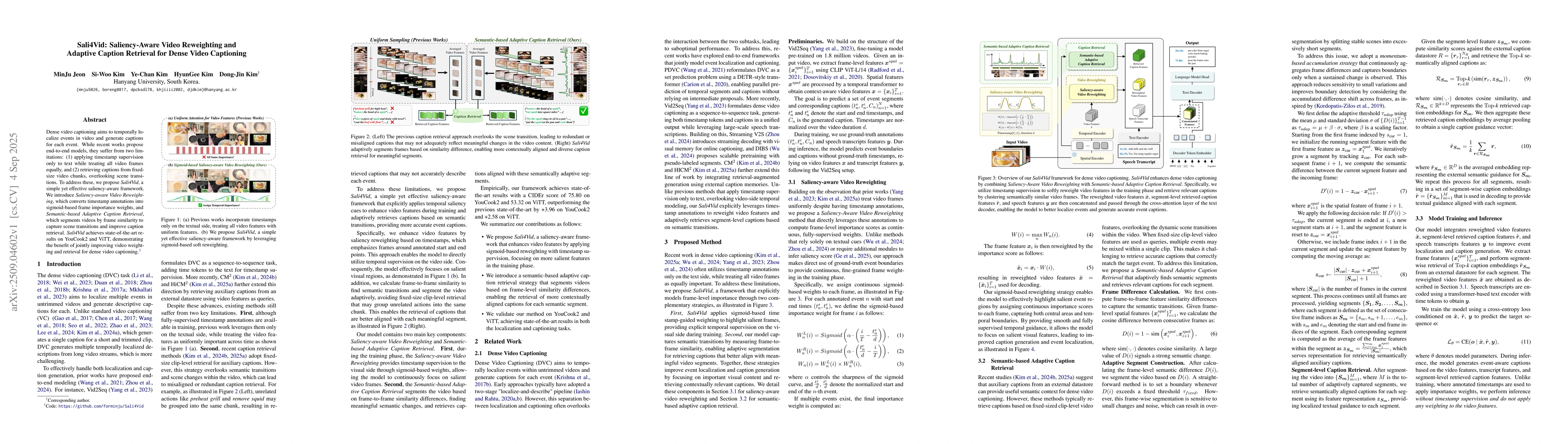 Dense video captioning aims to temporally localize events in video and generate captions for each event. While recent works propose end-to-end models, they suffer from two limitations: (1) applying timestamp supervision only to text while treating all video frames equally, and (2) retrieving captions from fixed-size video chunks, overlooking scene transitions. To address these, we propose Sali4Vid, a simple yet effective saliency-aware framework. We introduce Saliency-aware Video Reweighting, which converts timestamp annotations into sigmoid-based frame importance weights, and Semantic-based Adaptive Caption Retrieval, which segments videos by frame similarity to capture scene transitions and improve caption retrieval. Sali4Vid achieves state-of-the-art results on YouCook2 and ViTT, demonstrating the benefit of jointly improving video weighting and retrieval for dense video captioning