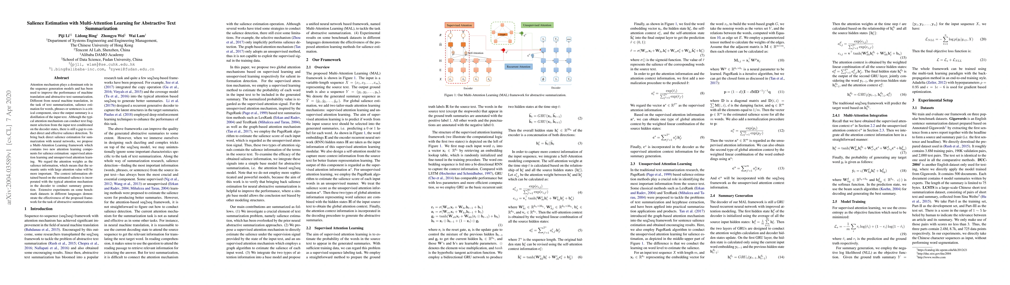 This paper proposes a Multi-Attention Learning framework for abstractive text summarization, introducing supervised and unsupervised attention learning components to directly estimate salience. The framework enhances summary generation by incorporating context information derived from salience estimation. Experimental results on various datasets show improved performance in abstractive summarization.