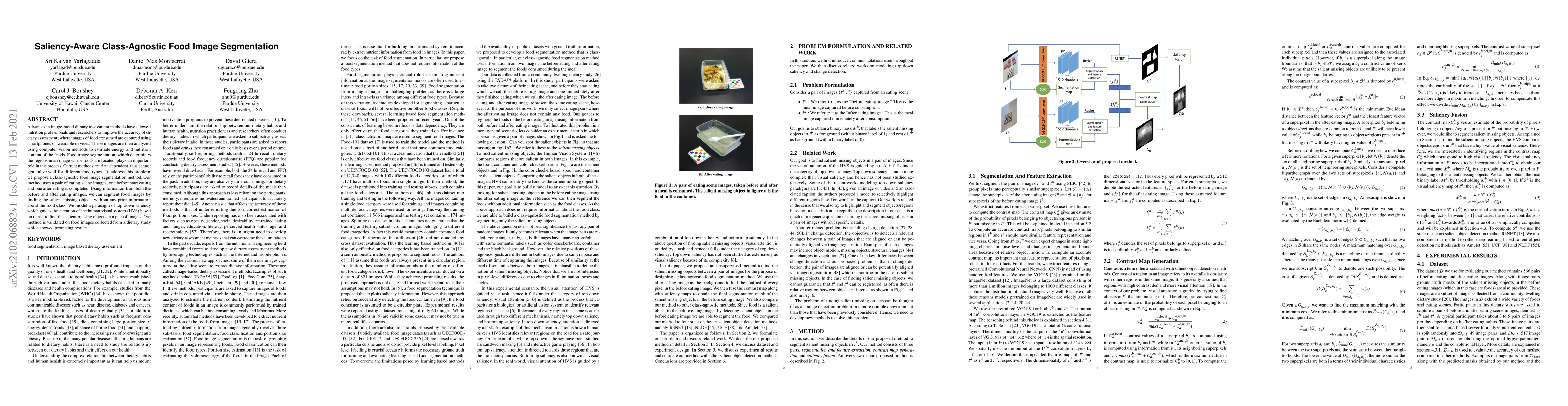 This paper proposes a class-agnostic food image segmentation method that uses saliency-based analysis of before-and-after eating scene images to identify salient missing objects without prior food class information. The method shows promising results in dietary assessment applications.