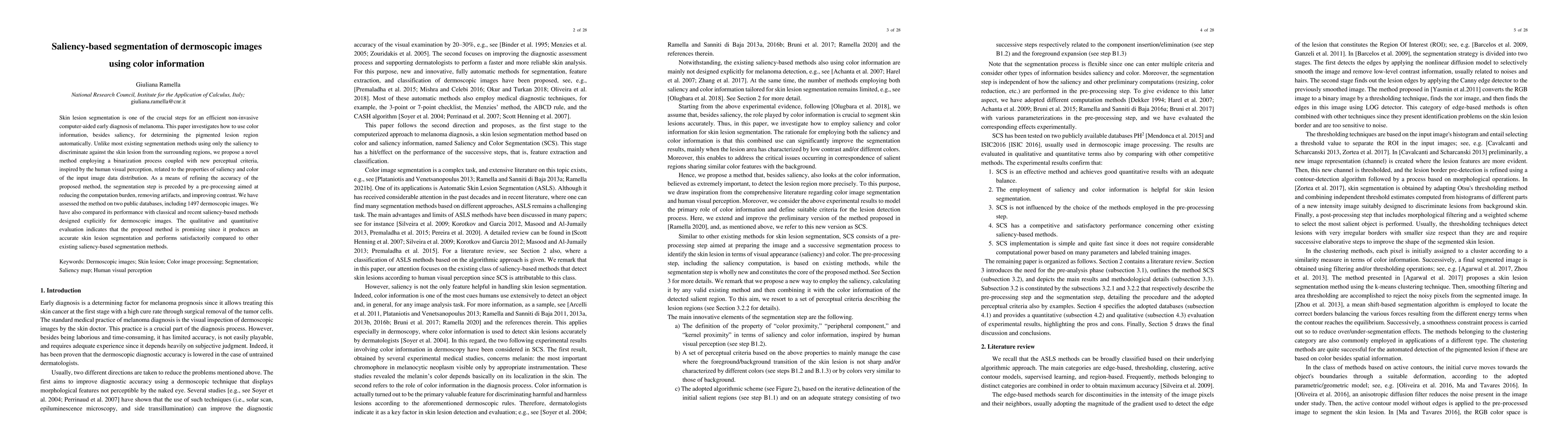Skin lesion segmentation is one of the crucial steps for an efficient non-invasive computer-aided early diagnosis of melanoma. This paper investigates how color information, besides saliency, can be used to determine the pigmented lesion region automatically. Unlike most existing segmentation methods using only the saliency in order to discriminate against the skin lesion from the surrounding regions, we propose a novel method employing a binarization process coupled with new perceptual criteria, inspired by the human visual perception, related to the properties of saliency and color of the input image data distribution. As a means of refining the accuracy of the proposed method, the segmentation step is preceded by a pre-processing aimed at reducing the computation burden, removing artifacts, and improving contrast. We have assessed the method on two public databases, including 1497 dermoscopic images. We have also compared its performance with classical and recent saliency-based methods designed explicitly for dermoscopic images. The qualitative and quantitative evaluation indicates that the proposed method is promising since it produces an accurate skin lesion segmentation and performs satisfactorily compared to other existing saliency-based segmentation methods.
