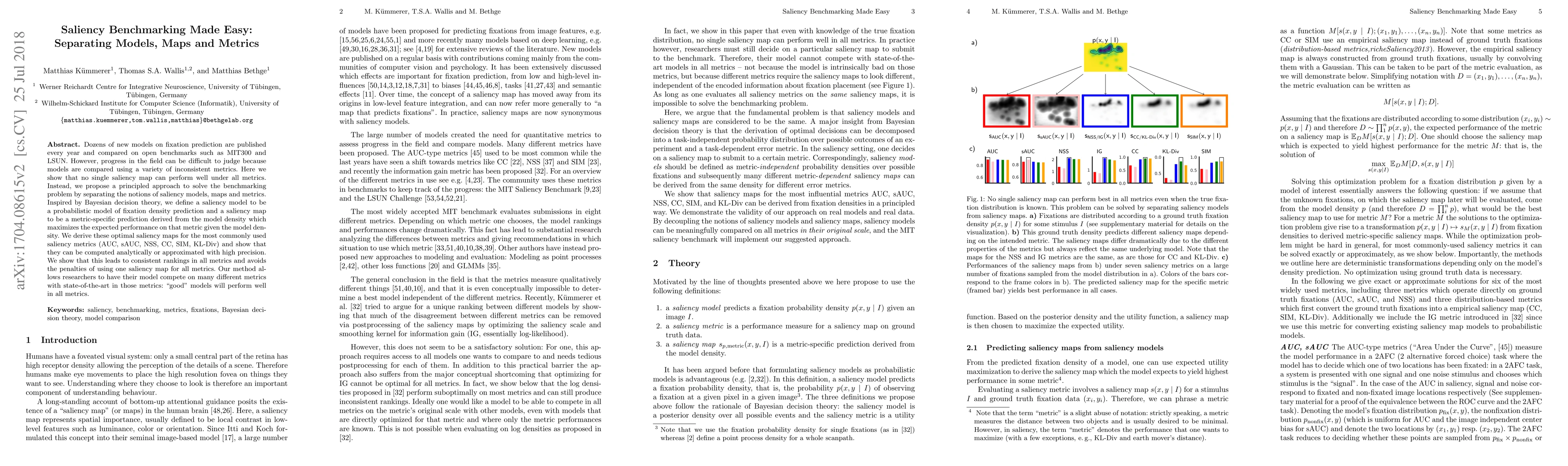 This paper proposes a method to standardize saliency benchmarking by separating saliency models, maps, and metrics. It defines optimal saliency maps for various metrics derived from model densities, leading to consistent model rankings across metrics and eliminating the drawbacks of using a single map for all metrics.