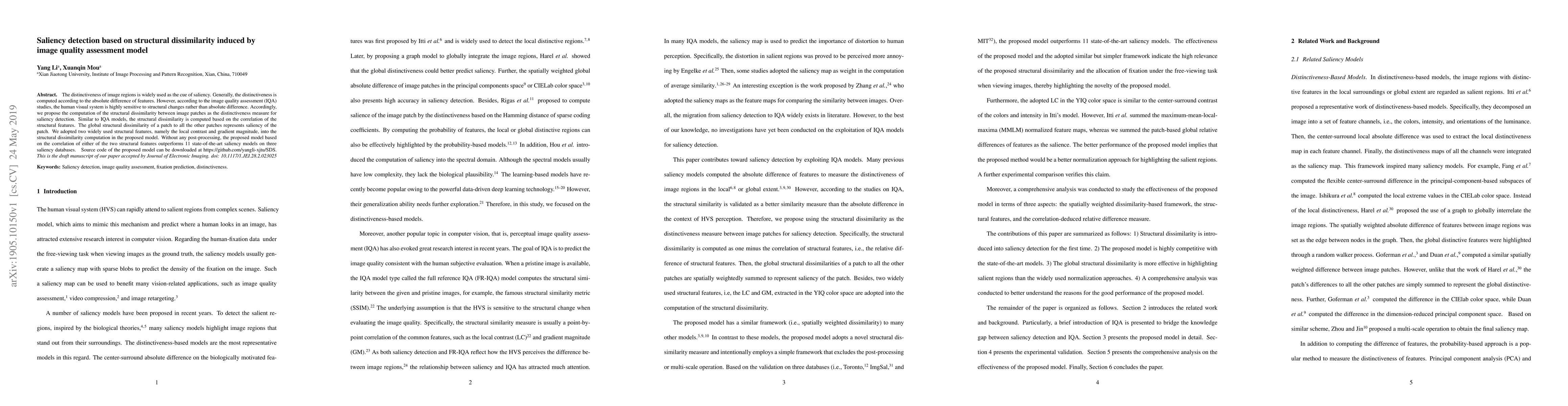 This paper proposes a saliency detection method based on structural dissimilarity, inspired by image quality assessment studies, which measures distinctiveness through the correlation of structural features like local contrast and gradient magnitude. The model outperforms 11 state-of-the-art saliency models without postprocessing.