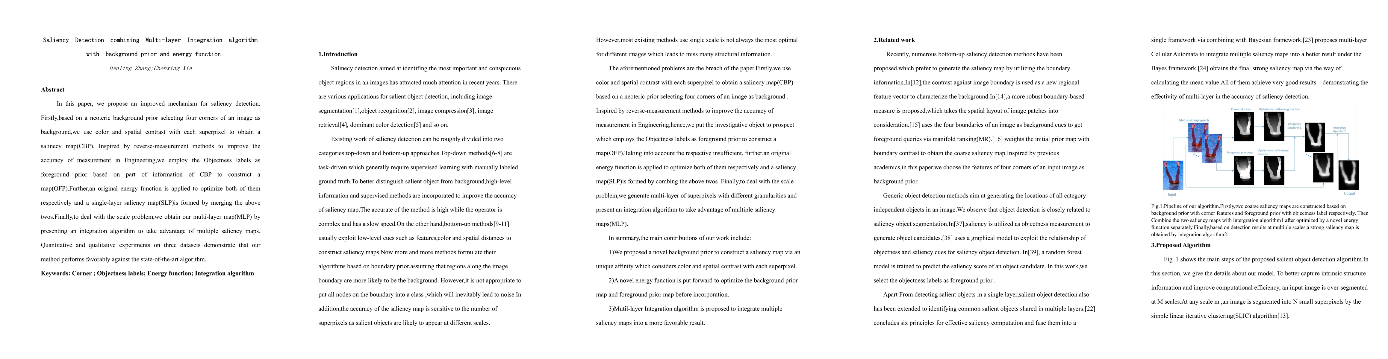 This paper proposes an improved saliency detection mechanism using a multi-layer integration algorithm. It combines a background prior based on image corners and an objectness label for foreground, optimizing them through an original energy function to form a multi-layer saliency map, outperforming state-of-the-art methods.