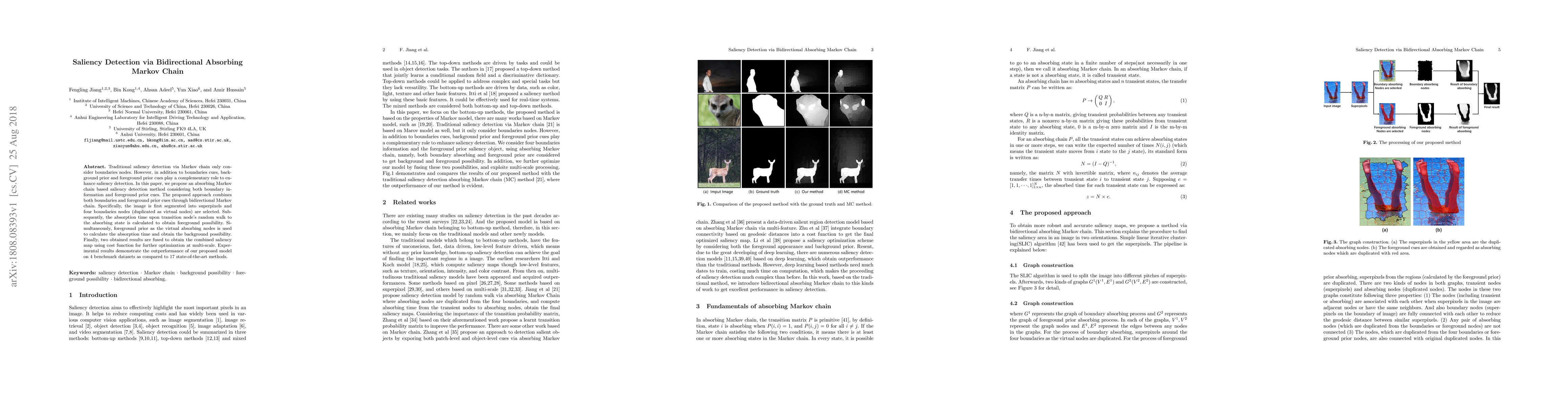 This paper proposes an absorbing Markov chain method for saliency detection that integrates both boundary and foreground prior cues through bidirectional transitions. The approach segments images into superpixels, calculates absorption times for both boundary and foreground virtual nodes, and fuses the results for an optimized saliency map, outperforming 17 state-of-the-art methods on benchmark datasets.