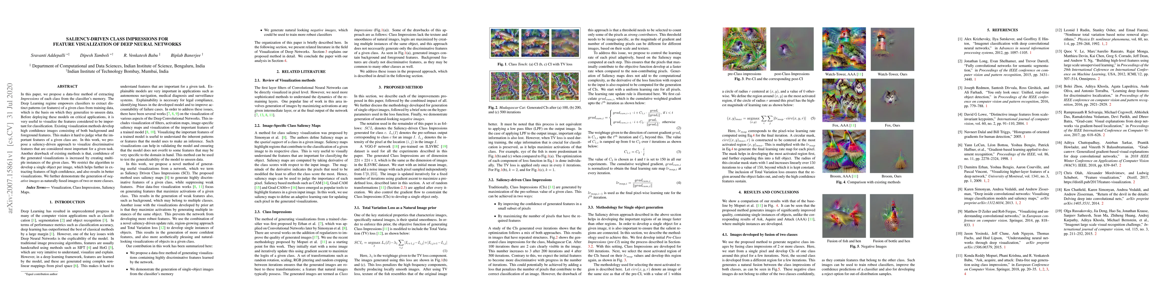 In this paper, we propose a data-free method of extracting Impressions of each class from the classifier's memory. The Deep Learning regime empowers classifiers to extract distinct patterns (or features) of a given class from training data, which is the basis on which they generalize to unseen data. Before deploying these models on critical applications, it is advantageous to visualize the features considered to be essential for classification. Existing visualization methods develop high confidence images consisting of both background and foreground features. This makes it hard to judge what the crucial features of a given class are. In this work, we propose a saliency-driven approach to visualize discriminative features that are considered most important for a given task. Another drawback of existing methods is that confidence of the generated visualizations is increased by creating multiple instances of the given class. We restrict the algorithm to develop a single object per image, which helps further in extracting features of high confidence and also results in better visualizations. We further demonstrate the generation of negative images as naturally fused images of two or more classes.