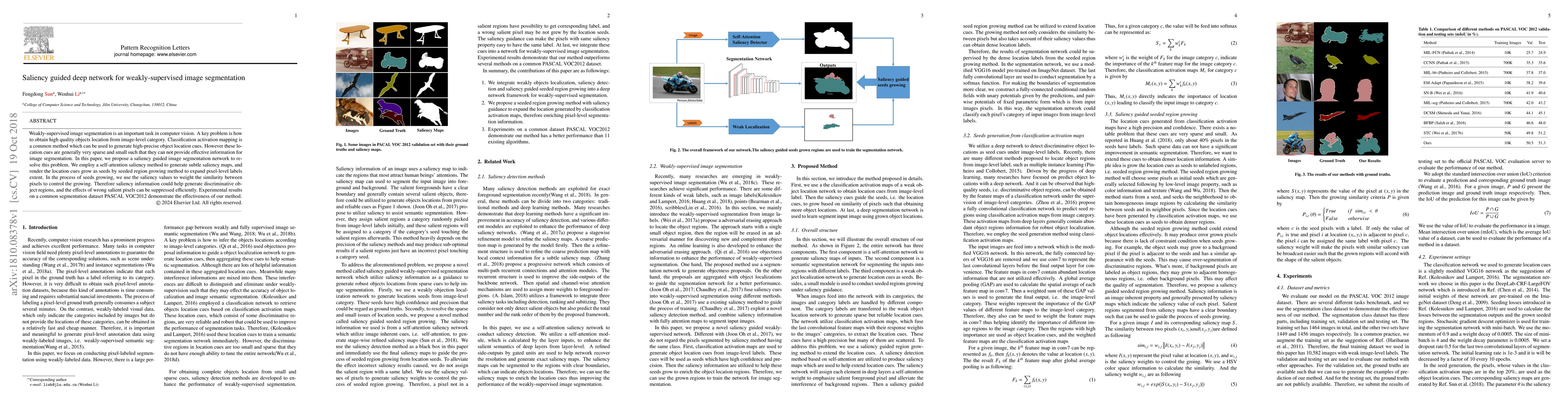 This research proposes a saliency guided deep network for weakly-supervised image segmentation, utilizing self-attention saliency maps and seeded region growing to expand pixel-level labels effectively, showing improved segmentation results on the PASCAL VOC2012 dataset.