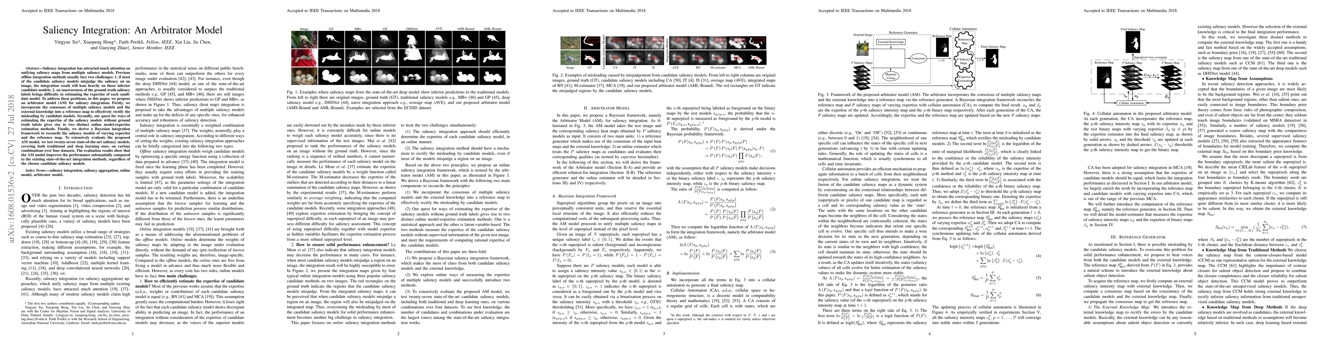 This paper proposes an arbitrator model (AM) for integrating saliency maps from multiple saliency models, addressing issues of model misjudgment and lack of ground truth labels. The AM model incorporates consensus and external knowledge to rectify errors, estimates model expertise without ground truth, and uses a Bayesian framework to reconcile varying expertise levels, significantly improving integration performance over existing methods.