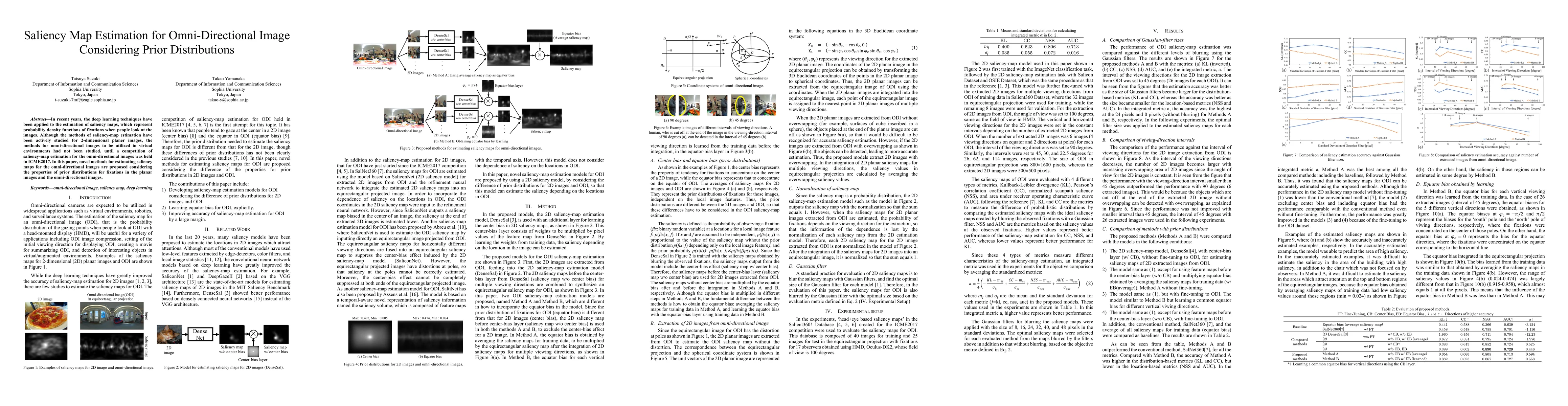 This paper proposes novel methods for estimating saliency maps for omni-directional images, addressing a gap in existing techniques for virtual environments. It leverages prior distributions from both planar and omni-directional images to enhance estimation accuracy.