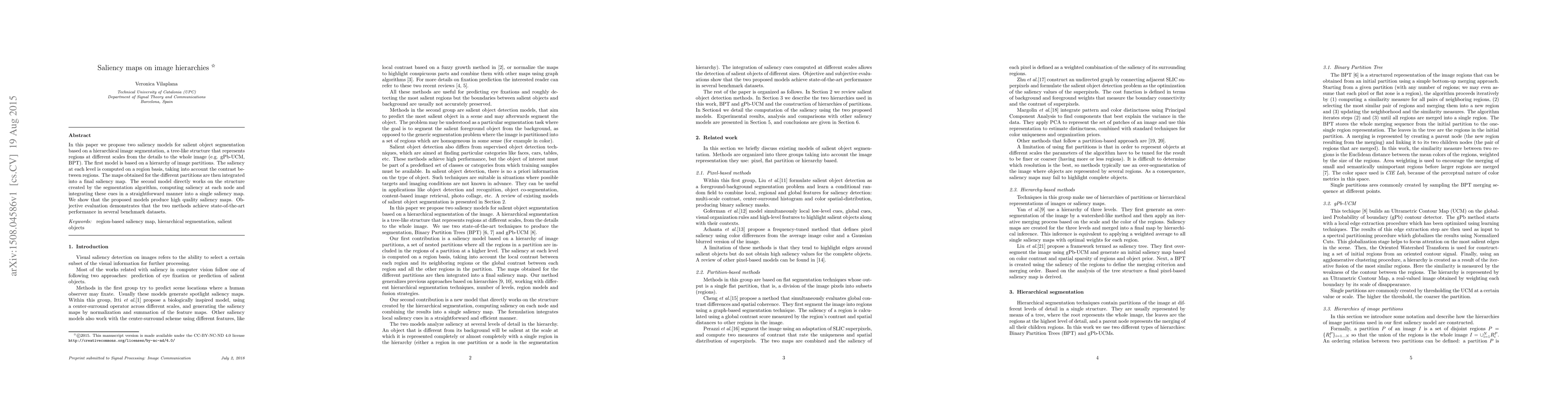 In this paper we propose two saliency models for salient object segmentation based on a hierarchical image segmentation, a tree-like structure that represents regions at different scales from the details to the whole image (e.g. gPb-UCM, BPT). The first model is based on a hierarchy of image partitions. The saliency at each level is computed on a region basis, taking into account the contrast between regions. The maps obtained for the different partitions are then integrated into a final saliency map. The second model directly works on the structure created by the segmentation algorithm, computing saliency at each node and integrating these cues in a straightforward manner into a single saliency map. We show that the proposed models produce high quality saliency maps. Objective evaluation demonstrates that the two methods achieve state-of-the-art performance in several benchmark datasets.