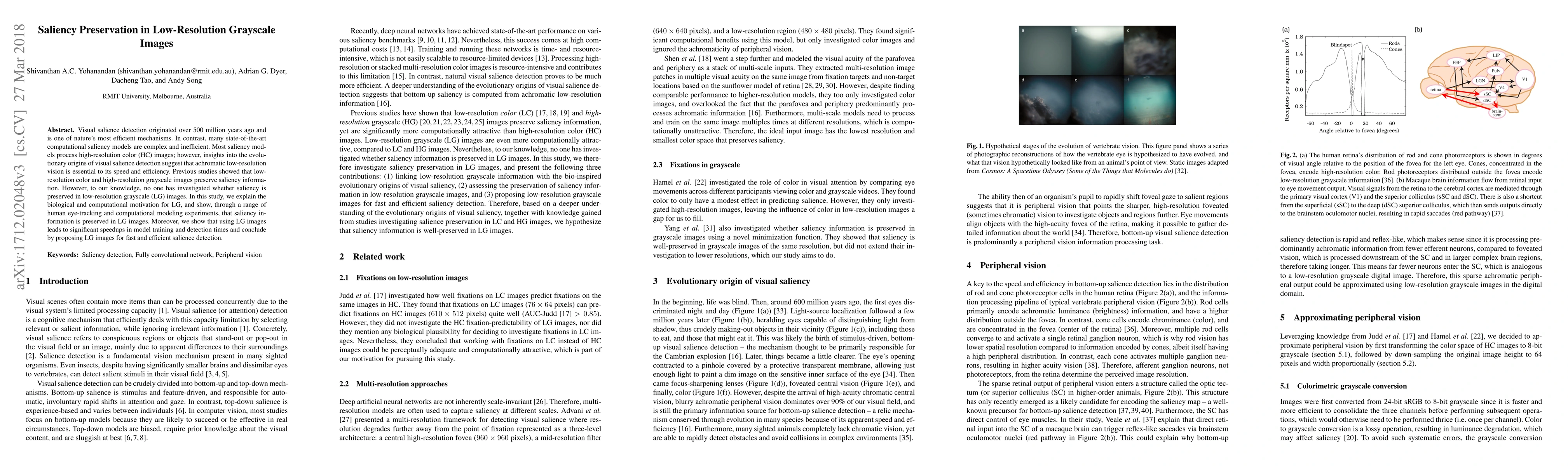 Visual salience detection originated over 500 million years ago and is one of nature's most efficient mechanisms. In contrast, many state-of-the-art computational saliency models are complex and inefficient. Most saliency models process high-resolution color (HC) images; however, insights into the evolutionary origins of visual salience detection suggest that achromatic low-resolution vision is essential to its speed and efficiency. Previous studies showed that low-resolution color and high-resolution grayscale images preserve saliency information. However, to our knowledge, no one has investigated whether saliency is preserved in low-resolution grayscale (LG) images. In this study, we explain the biological and computational motivation for LG, and show, through a range of human eye-tracking and computational modeling experiments, that saliency information is preserved in LG images. Moreover, we show that using LG images leads to significant speedups in model training and detection times and conclude by proposing LG images for fast and efficient salience detection.