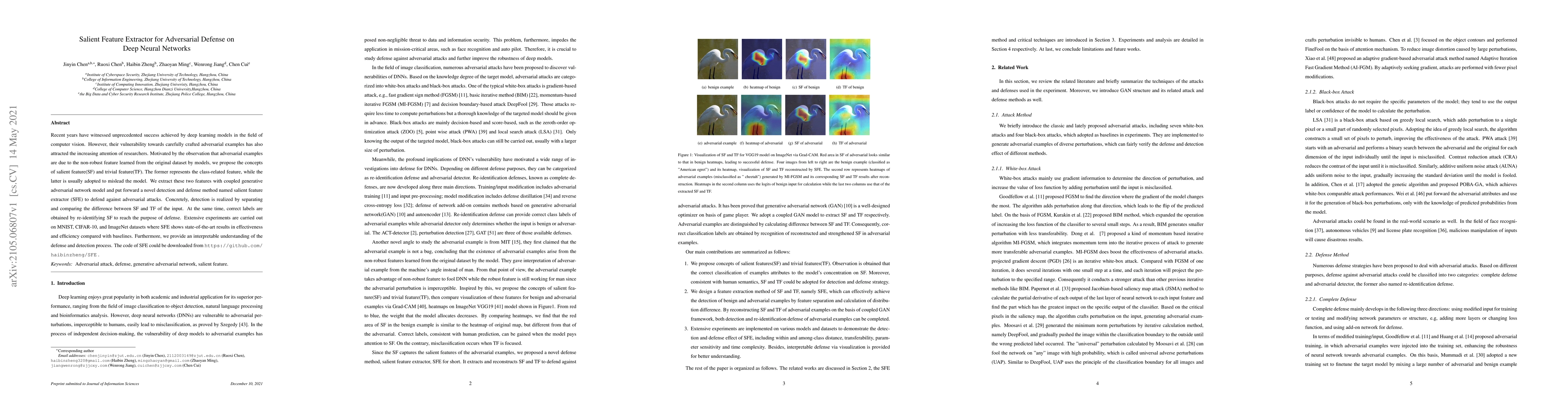 This paper proposes a Salient Feature Extractor (SFE) to defend deep neural networks against adversarial attacks by distinguishing between salient features (SF) and trivial features (TF). The SFE method uses a coupled GAN model to detect and mitigate adversarial examples, achieving state-of-the-art results on MNIST, CIFAR-10, and ImageNet datasets.