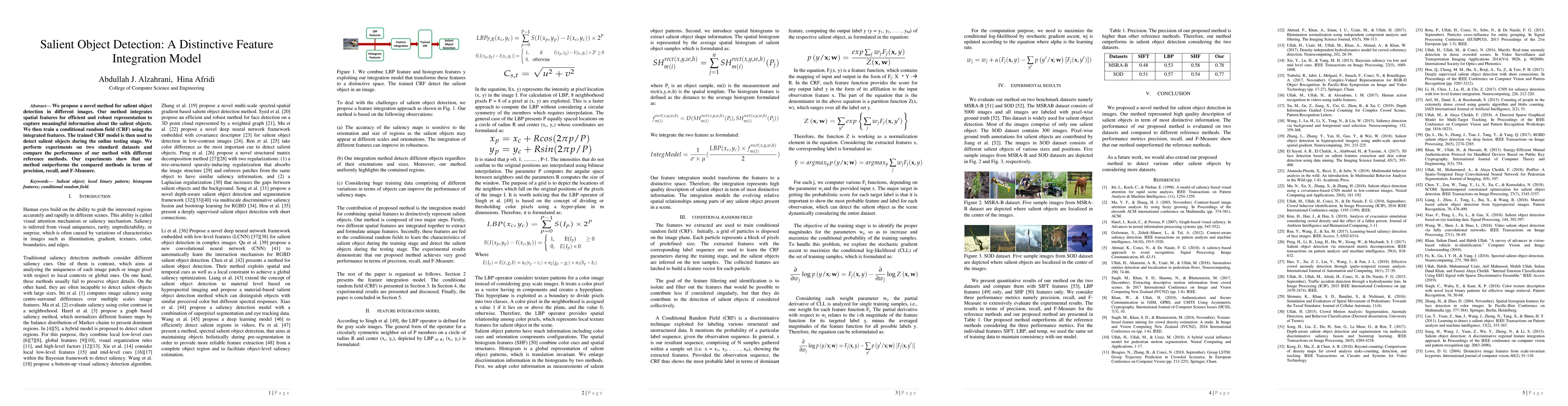 A new salient object detection method is proposed, which integrates spatial features for efficient representation and uses a conditional random field to capture meaningful information about the objects, outperforming other methods in precision, recall, and F-Measure.