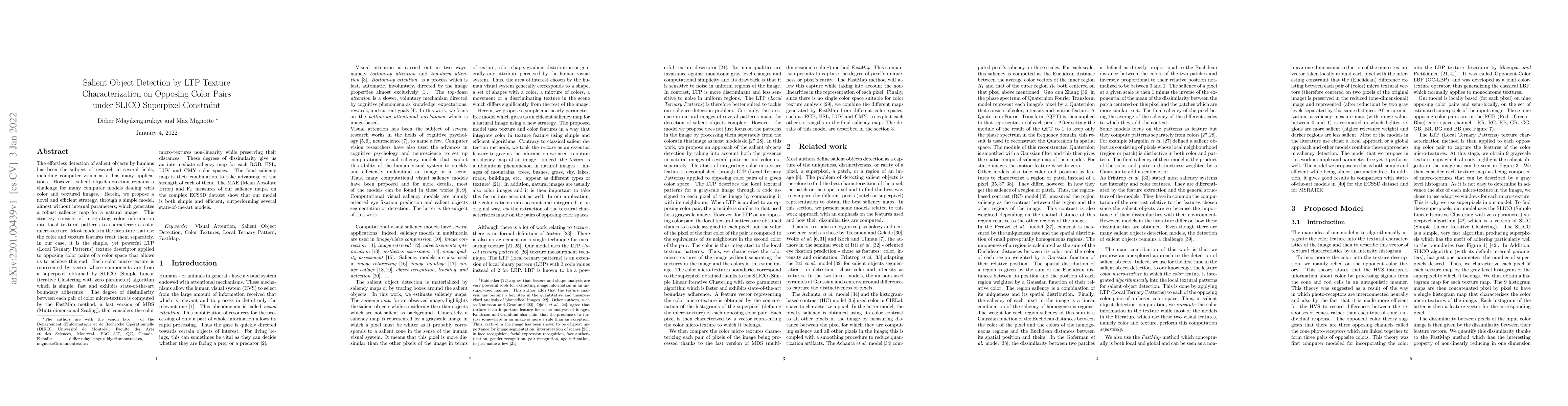 This paper proposes a novel method for salient object detection using LTP texture characterization on opposing color pairs under SLICO superpixel constraint. The approach integrates color information with local textural patterns to generate a robust saliency map, outperforming state-of-the-art models on the ECSSD dataset.