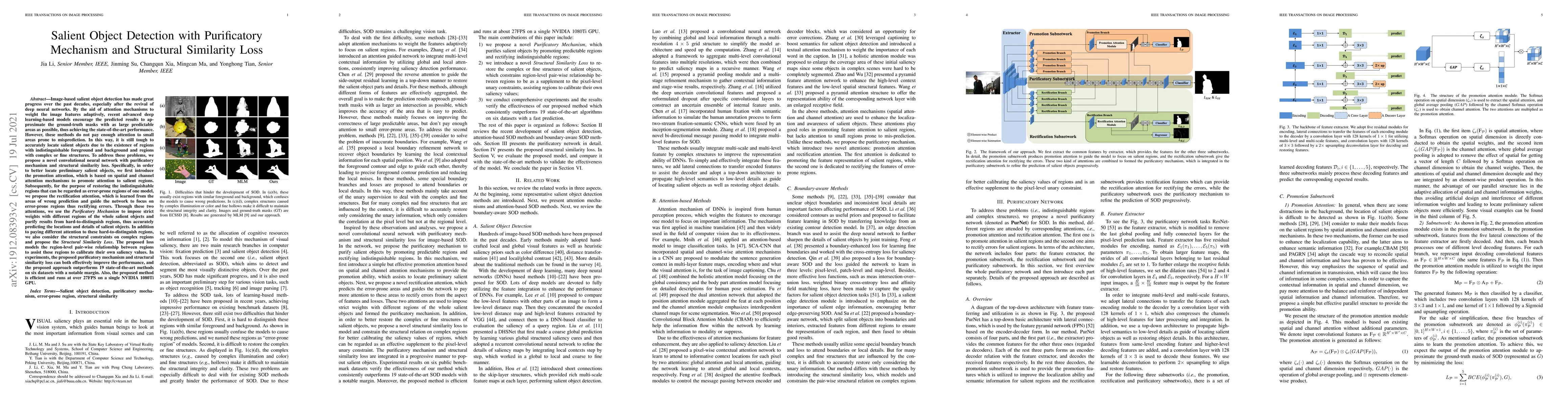 By the aid of attention mechanisms to weight the image features adaptively, recent advanced deep learning-based models encourage the predicted results to approximate the ground-truth masks with as large predictable areas as possible, thus achieving the state-of-the-art performance. However, these methods do not pay enough attention to small areas prone to misprediction. In this way, it is still tough to accurately locate salient objects due to the existence of regions with indistinguishable foreground and background and regions with complex or fine structures. To address these problems, we propose a novel convolutional neural network with purificatory mechanism and structural similarity loss. Specifically, in order to better locate preliminary salient objects, we first introduce the promotion attention, which is based on spatial and channel attention mechanisms to promote attention to salient regions. Subsequently, for the purpose of restoring the indistinguishable regions that can be regarded as error-prone regions of one model, we propose the rectification attention, which is learned from the areas of wrong prediction and guide the network to focus on error-prone regions thus rectifying errors. Through these two attentions, we use the Purificatory Mechanism to impose strict weights with different regions of the whole salient objects and purify results from hard-to-distinguish regions, thus accurately predicting the locations and details of salient objects. In addition to paying different attention to these hard-to-distinguish regions, we also consider the structural constraints on complex regions and propose the Structural Similarity Loss. In experiments, the proposed approach outperforms 19 state-of-the-art methods on six datasets with a notable margin at over 27FPS on a single NVIDIA 1080Ti GPU.