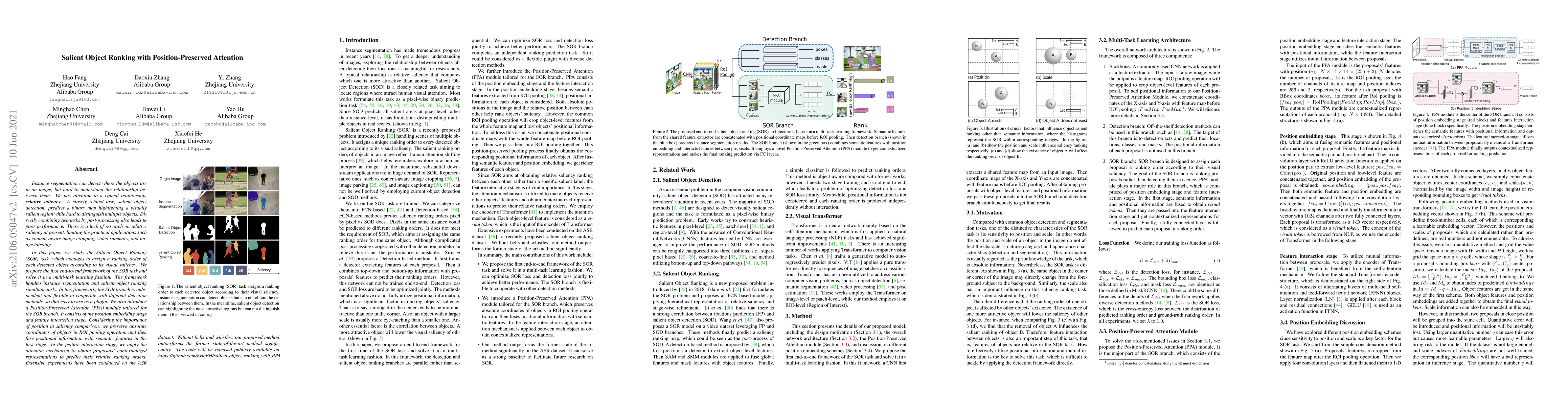 This paper proposes an end-to-end framework for the Salient Object Ranking (SOR) task, which ranks detected objects based on their visual saliency. The framework employs a Position-Preserved Attention (PPA) module to integrate positional information with semantic features, achieving superior performance compared to previous methods on the ASR dataset.