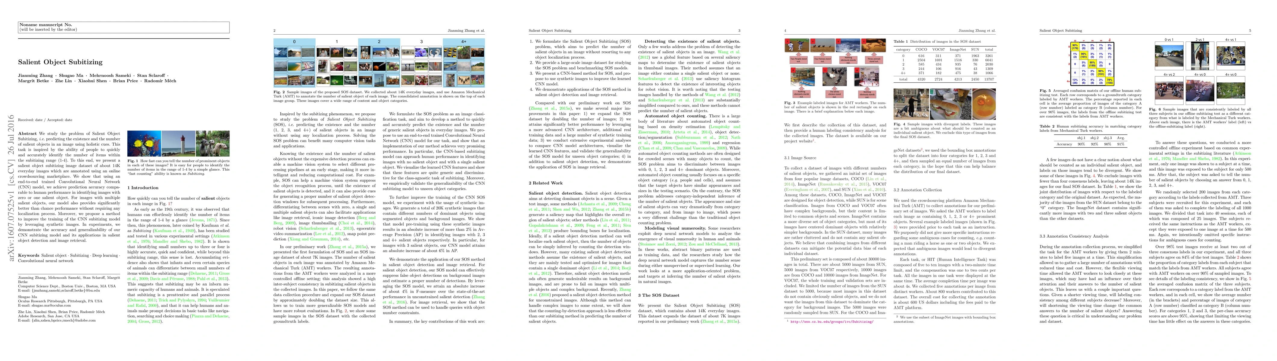 This paper introduces a dataset for Salient Object Subitizing, aiming to predict the number of prominent objects in images using CNNs. The authors achieve human-level accuracy for images with one salient object and better-than-chance performance for multiple objects, demonstrating the model's potential in salient object detection and image retrieval.