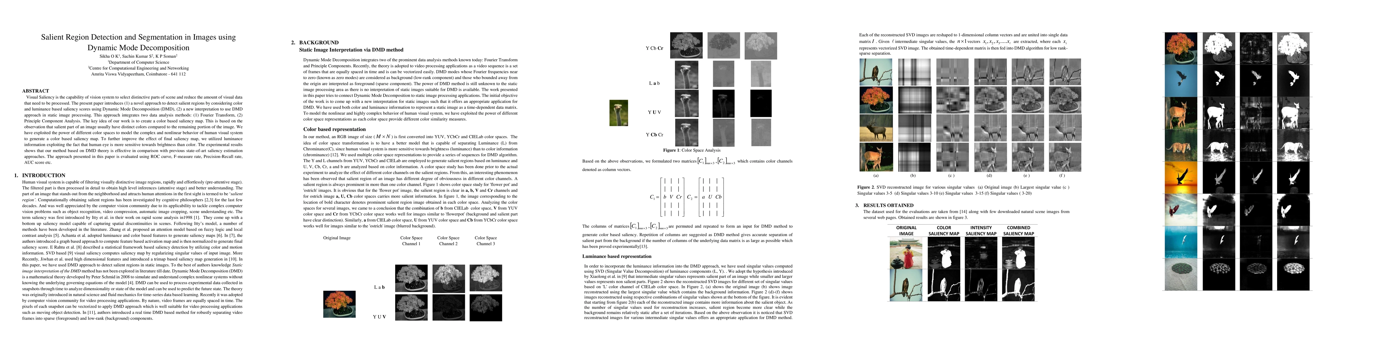 Visual Saliency is the capability of vision system to select distinctive parts of scene and reduce the amount of visual data that need to be processed. The presentpaper introduces (1) a novel approach to detect salient regions by considering color and luminance based saliency scores using Dynamic Mode Decomposition (DMD), (2) a new interpretation to use DMD approach in static image processing. This approach integrates two data analysis methods: (1) Fourier Transform, (2) Principle Component Analysis.The key idea of our work is to create a color based saliency map. This is based on the observation thatsalient part of an image usually have distinct colors compared to the remaining portion of the image. We have exploited the power of different color spaces to model the complex and nonlinear behavior of human visual system to generate a color based saliency map. To further improve the effect of final saliency map, weutilized luminance information exploiting the fact that human eye is more sensitive towards brightness than color.The experimental results shows that our method based on DMD theory is effective in comparison with previous state-of-art saliency estimation approaches. The approach presented in this paperis evaluated using ROC curve, F-measure rate, Precision-Recall rate, AUC score etc.