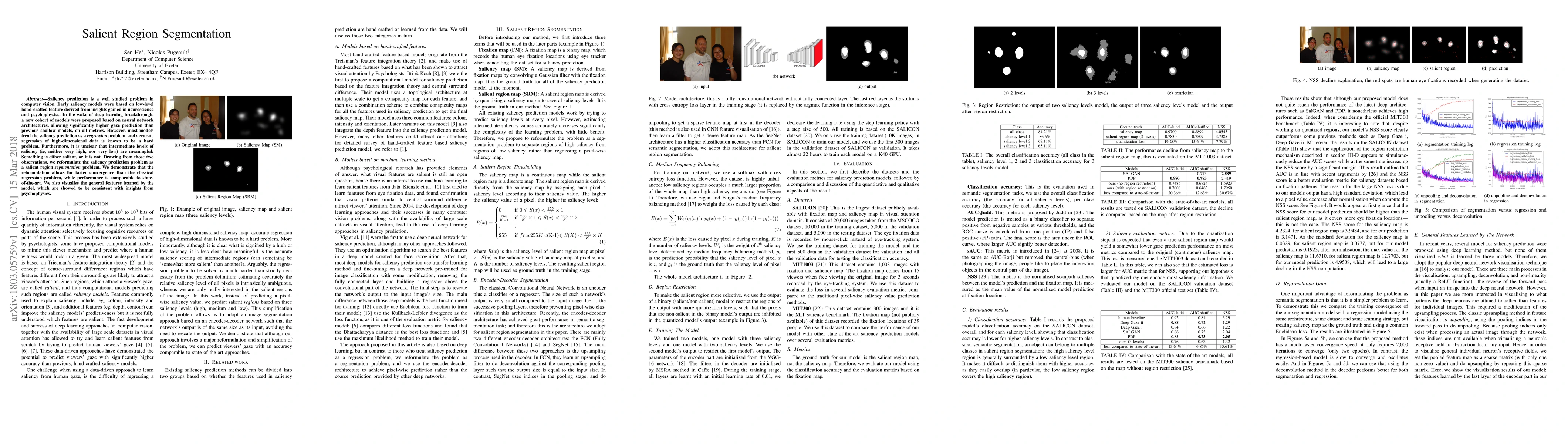 Saliency prediction is a well studied problem in computer vision. Early saliency models were based on low-level hand-crafted feature derived from insights gained in neuroscience and psychophysics. In the wake of deep learning breakthrough, a new cohort of models were proposed based on neural network architectures, allowing significantly higher gaze prediction than previous shallow models, on all metrics. However, most models treat the saliency prediction as a \textit{regression} problem, and accurate regression of high-dimensional data is known to be a hard problem. Furthermore, it is unclear that intermediate levels of saliency (ie, neither very high, nor very low) are meaningful: Something is either salient, or it is not. Drawing from those two observations, we reformulate the saliency prediction problem as a salient region \textit{segmentation} problem. We demonstrate that the reformulation allows for faster convergence than the classical regression problem, while performance is comparable to state-of-the-art. We also visualise the general features learned by the model, which are showed to be consistent with insights from psychophysics.