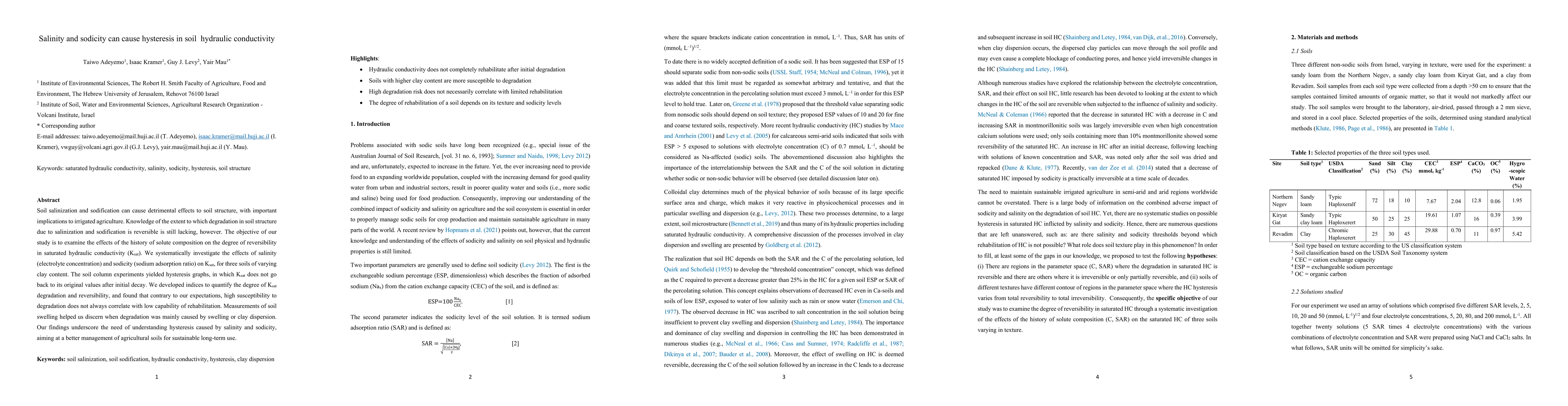 This study investigates the hysteresis in soil hydraulic conductivity caused by salinity and sodicity, finding that soil degradation due to these factors is not always reversible. The research highlights the importance of understanding these processes for sustainable agricultural soil management.