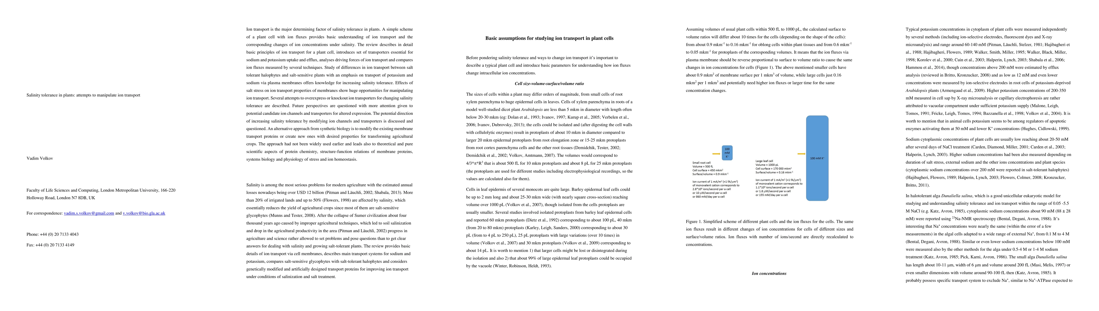 Ion transport is the major determining factor of salinity tolerance in plants. A simple scheme of a plant cell with ion fluxes provides basic understanding of ion transport and the corresponding changes of ion concentrations under salinity. The review describes in detail basic principles of ion transport for a plant cell, introduces set of transporters essential for sodium and potassium uptake and efflux, analyses driving forces of ion transport and compares ion fluxes measured by several techniques. Study of differences in ion transport between salt tolerant halophytes and salt-sensitive plants with an emphasis on transport of potassium and sodium via plasma membranes offers knowledge for increasing salinity tolerance. Effects of salt stress on ion transport properties of membranes show huge opportunities for manipulating ion transport. Several attempts to overexpress or knockout ion transporters for changing salinity tolerance are described. Future perspectives are questioned with more attention given to potential candidate ion channels and transporters for altered expression. The potential direction of increasing salinity tolerance by modifying ion channels and transporters is discussed and questioned. An alternative approach from synthetic biology is to modify the existing membrane transport proteins or create new ones with desired properties for transforming agricultural crops. The approach had not been widely used earlier and leads also to theoretical and pure scientific aspects of protein chemistry, structure-function relations of membrane proteins, systems biology and physiology of stress and ion homeostasis.