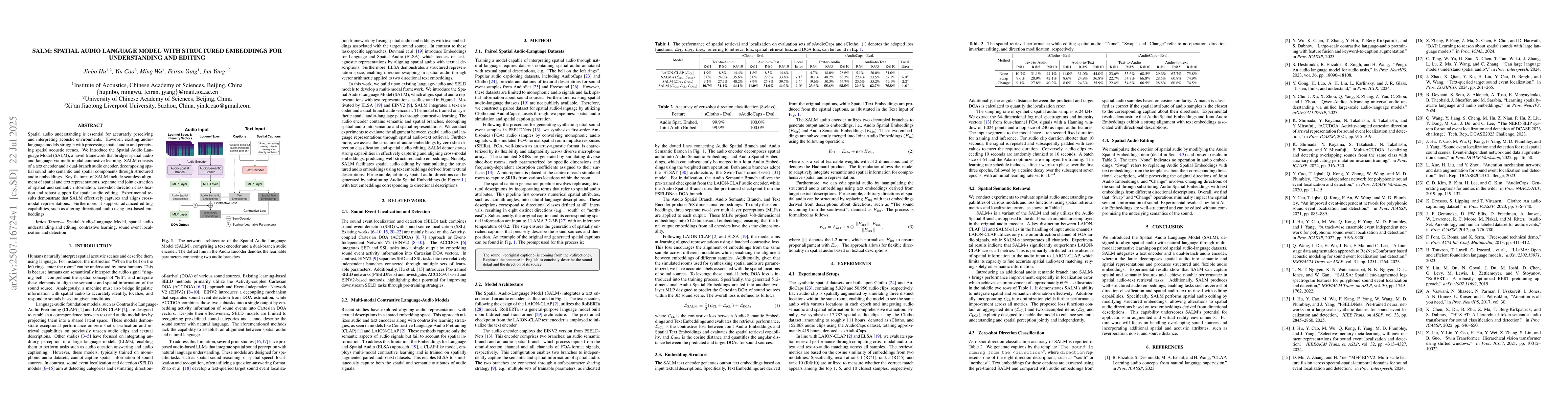 SALM's novelty lies in its dual-branch audio encoder that separately and jointly extracts spatial and semantic information, combined with multi-modal contrastive learning for aligning spatial audio representations with text representations. This approach allows for zero-shot direction classification and robust support for spatial audio editing.