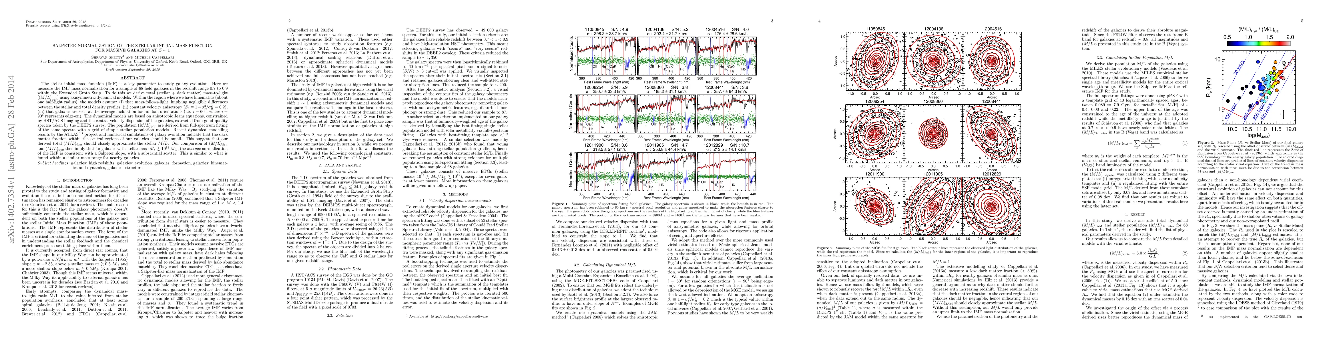 The stellar initial mass function (IMF) is a key parameter to study galaxy evolution. Here we measure the IMF mass normalization for a sample of 68 field galaxies in the redshift range 0.7 to 0.9 within the Extended Groth Strip. To do this we derive total (stellar + dark matter) mass-to-light [$(M/L)_{\rm dyn}$] using axisymmetric dynamical models. Within the region where we have kinematics (about one half-light radius), the models assume: (i) that mass-follows-light, implying negligible differences between the stellar and total density profiles; (ii) constant velocity anisotropy ($\beta_{\rm z}\equiv1-\sigma_z^2/\sigma_R^2=0.2$); (iii) that galaxies are seen at the average inclination for random orientations (i.e. $i=60^\circ$, where $i=90^\circ$ represents edge-on). The dynamical models are based on anisotropic Jeans equations, constrained by HST/ACS imaging and the central velocity dispersion of the galaxies, extracted from good-quality spectra taken by the DEEP2 survey. The population $(M/L)_{\rm pop}$ are derived from full-spectrum fitting of the same spectra with a grid of simple stellar population models. Recent dynamical modelling results by the $ATLAS^{3D}$ project and numerical simulations of galaxy evolution indicate that the dark matter fraction within the central regions of our galaxies should be small. This suggest that our derived total $(M/L)_{\rm dyn}$ should closely approximate the stellar $M/L$. Our comparison of $(M/L)_{\rm dyn}$ and $(M/L)_{\rm pop}$ then imply that for galaxies with stellar mass $M_\odot \geq 10^{11}$ $M_{\odot}$, the $average$ normalization of the IMF is consistent with a Salpeter slope, with a substantial scatter. This is similar to what is found within a similar mass range for nearby galaxies.