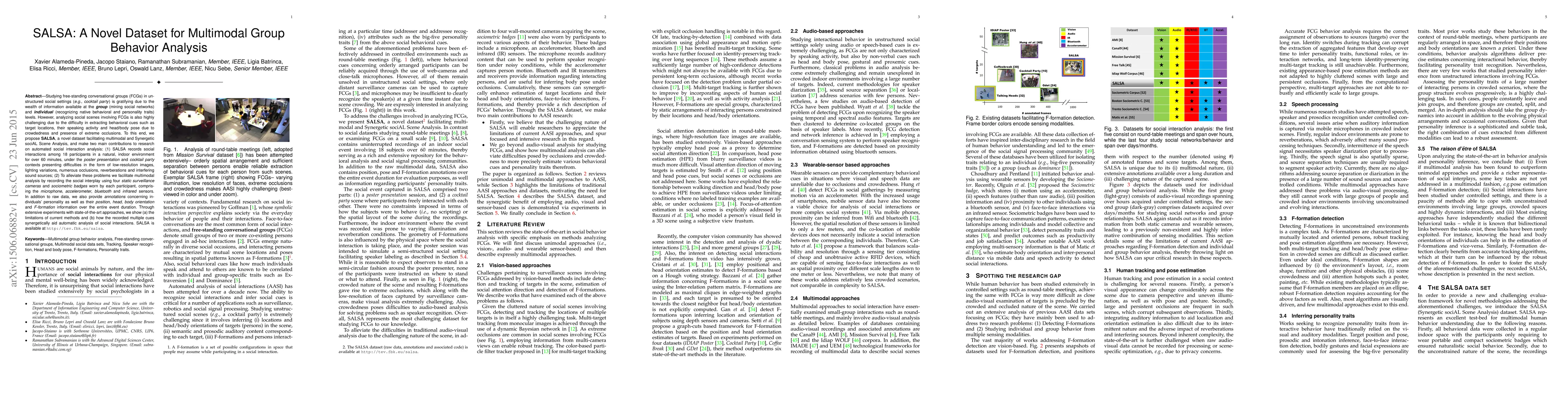 The research introduces SALSA, a dataset for analyzing free-standing conversational groups in complex social settings. It records 18 participants in challenging conditions, using surveillance cameras and sociometric badges with various sensors. The dataset aids in multimodal analysis, providing annotations on individuals' personality, position, orientation, and group formations, demonstrating the benefits of combined cues for automatic social interaction analysis.