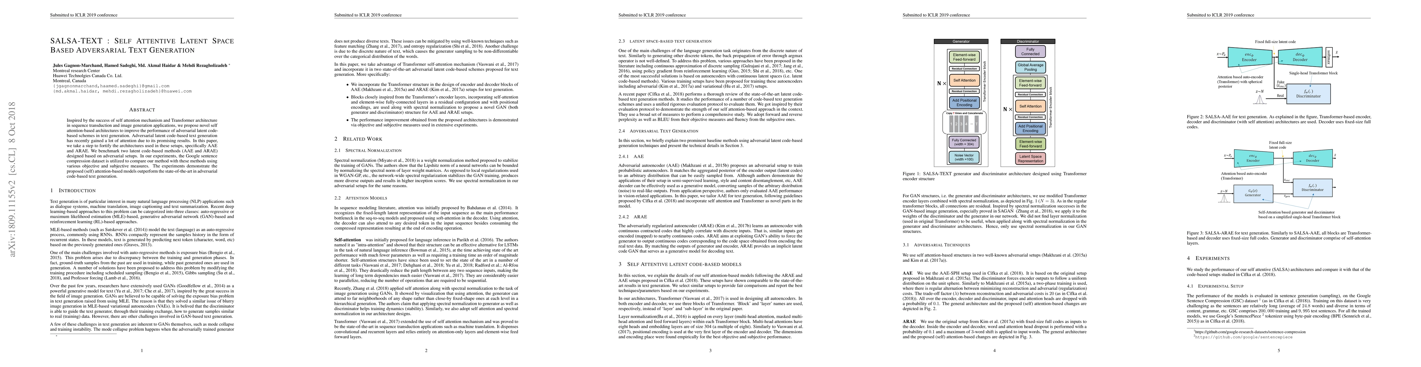 This paper proposes novel self-attention-based architectures to enhance adversarial latent code-based text generation, outperforming existing methods like AAE and ARAE. Experiments on the Google sentence compression dataset show significant improvements using objective and subjective measures.