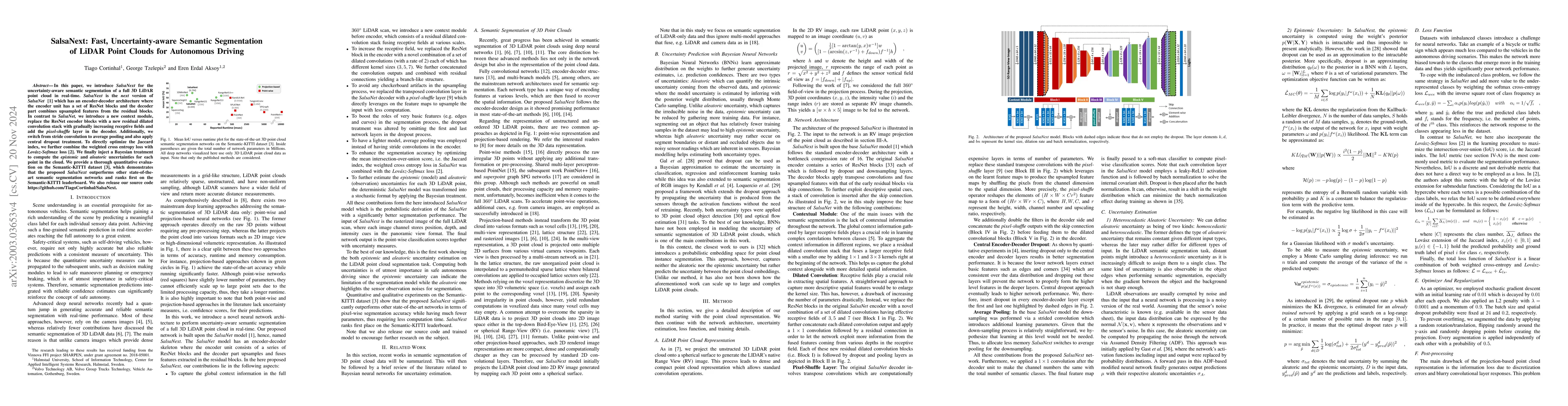 SalsaNext enhances real-time, uncertainty-aware semantic segmentation of LiDAR point clouds using an encoder-decoder architecture with dilated convolutions and a Bayesian treatment for uncertainty estimation. It outperforms existing methods on the Semantic-KITTI dataset and ranks first on its leaderboard.