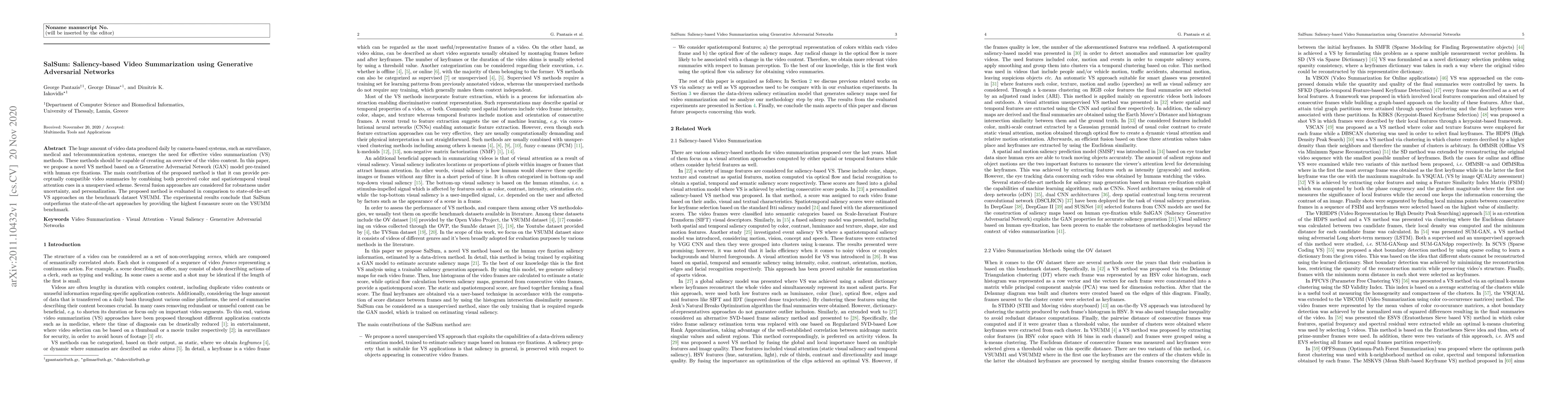 The huge amount of video data produced daily by camera-based systems, such as surveilance, medical and telecommunication systems, emerges the need for effective video summarization (VS) methods. These methods should be capable of creating an overview of the video content. In this paper, we propose a novel VS method based on a Generative Adversarial Network (GAN) model pre-trained with human eye fixations. The main contribution of the proposed method is that it can provide perceptually compatible video summaries by combining both perceived color and spatiotemporal visual attention cues in a unsupervised scheme. Several fusion approaches are considered for robustness under uncertainty, and personalization. The proposed method is evaluated in comparison to state-of-the-art VS approaches on the benchmark dataset VSUMM. The experimental results conclude that SalSum outperforms the state-of-the-art approaches by providing the highest f-measure score on the VSUMM benchmark.