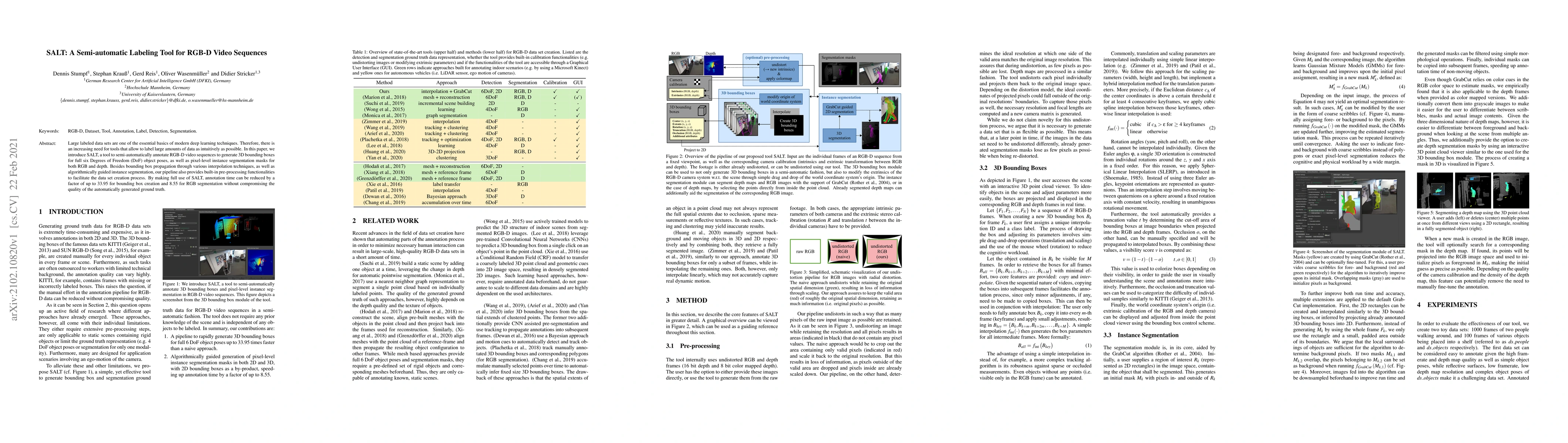 Large labeled data sets are one of the essential basics of modern deep learning techniques. Therefore, there is an increasing need for tools that allow to label large amounts of data as intuitively as possible. In this paper, we introduce SALT, a tool to semi-automatically annotate RGB-D video sequences to generate 3D bounding boxes for full six Degrees of Freedom (DoF) object poses, as well as pixel-level instance segmentation masks for both RGB and depth. Besides bounding box propagation through various interpolation techniques, as well as algorithmically guided instance segmentation, our pipeline also provides built-in pre-processing functionalities to facilitate the data set creation process. By making full use of SALT, annotation time can be reduced by a factor of up to 33.95 for bounding box creation and 8.55 for RGB segmentation without compromising the quality of the automatically generated ground truth.