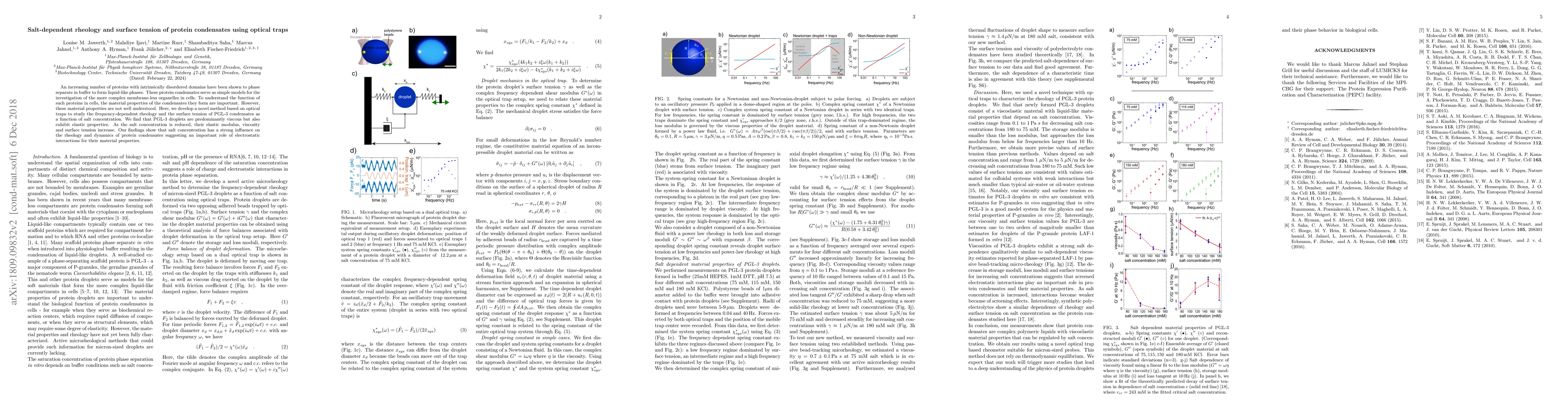 This study employs optical traps to investigate the rheology and surface tension of PGL-3 protein condensates across varying salt concentrations, revealing that reduced salt enhances both elasticity and viscosity. The findings underscore the significant role of electrostatic interactions in determining the material properties of these condensates.