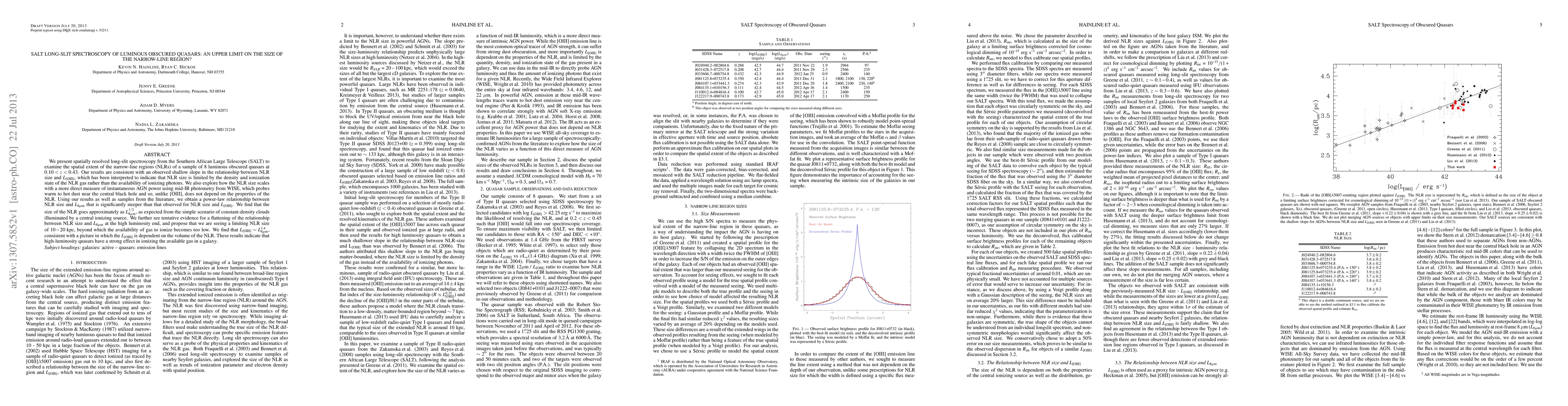 We present spatially resolved long-slit spectroscopy from the Southern African Large Telescope (SALT) to examine the spatial extent of the narrow-line regions (NLRs) of a sample of 8 luminous obscured quasars at 0.10 < z < 0.43. Our results are consistent with an observed shallow slope in the relationship between NLR size and L_[OIII], which has been interpreted to indicate that NLR size is limited by the density and ionization state of the NLR gas rather than the availability of ionizing photons. We also explore how the NLR size scales with a more direct measure of instantaneous AGN power using mid-IR photometry from WISE, which probes warm to hot dust near the central black hole and so, unlike [OIII], does not depend on the properties of the NLR. Using our results as well as samples from the literature, we obtain a power-law relationship between NLR size and L_8micron that is significantly steeper than that observed for NLR size and L_[OIII]. We find that the size of the NLR goes approximately as L^(1/2)_8micron, as expected from the simple scenario of constant-density clouds illuminated by a central ionizing source. We further see tentative evidence for a flattening of the relationship between NLR size and L_8micron at the high luminosity end, and propose that we are seeing a limiting NLR size of 10 - 20 kpc, beyond which the availability of gas to ionize becomes too low. We find that L_[OIII] ~ L_8micron^(1.4), consistent with a picture in which the L_[OIII] is dependent on the volume of the NLR. These results indicate that high-luminosity quasars have a strong effect in ionizing the available gas in a galaxy.