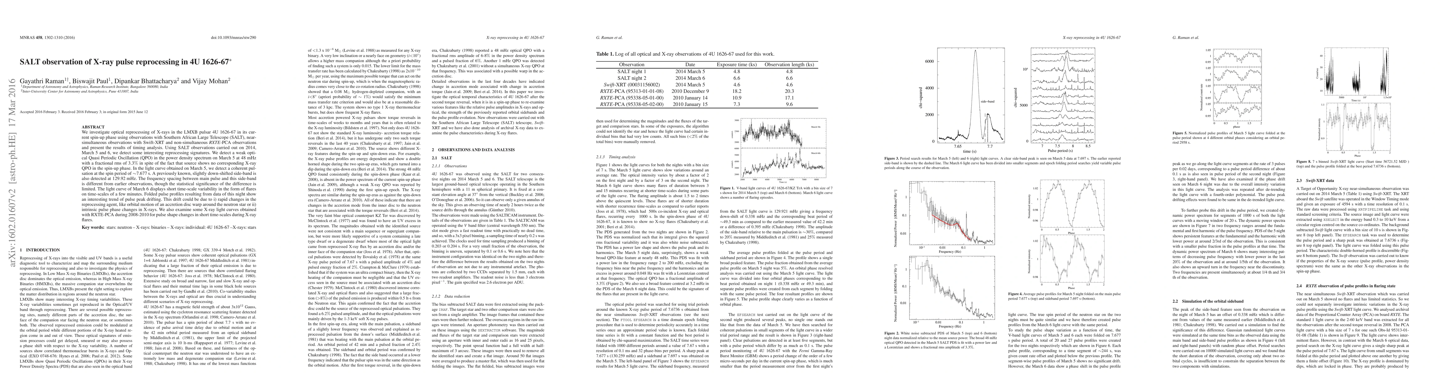 We investigate optical reprocessing of X-rays in the LMXB pulsar 4U 1626-67 in its current spin-up phase using observations with Southern African Large Telescope (SALT), near-simultaneous observations with Swift-XRT and non-simultaneous RXTE-PCA observations and present the results of timing analysis. Using SALT observations carried out on 5th and 6th March, 2014, we detect some interesting reprocessing signatures. We detect a weak optical Quasi Periodic Oscillation (QPO) in the power density spectrum on March 5th at 48 mHz with a fractional rms of 3.3% in spite of the fact that source shows no corresponding X-ray QPO in the spin-up phase. In the light curve obtained on March 5th, we detect a coherent pulsation at the spin period of ~7.677 s. A previously known, slightly down-shifted side-band is also detected at 129.92 mHz. The frequency spacing between main pulse and this side-band is different from earlier observations, though the statistical significance of the difference is limited. The light curve of 6th March displays short time-scale variability in the form of flares on timescales of a few minutes. Folded pulse profiles resulting from data of this night show an interesting trend of pulse peak drifting. This drift could be due to i) rapid changes in the reprocessing agent, like orbital motion of an accretion disk warp around the neutron star or ii) intrinsic pulse phase changes in X-rays. We also examine some X-ray light curves obtained with RXTE-PCA during 2008-2010 for pulse shape changes in short time scales during X-ray flares.
