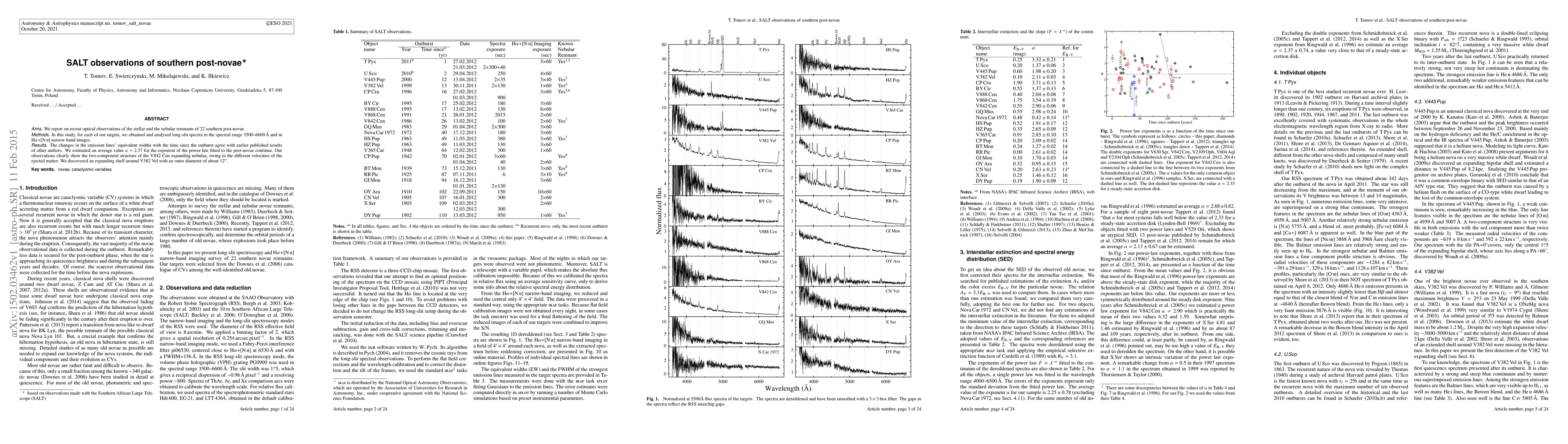 We report on recent optical observations of the stellar and the nebular remnants of 22 southern post-novae. In this study, for each of our targets, we obtained and analysed long-slit spectra in the spectral range 3500-6600 A and in H$\alpha$+NII narrow-band images. The changes in the emission lines' equivalent widths with the time since the outburst agree with earlier published results of other authors. We estimated an average value $\alpha$=2.37 for the exponent of the power law fitted to the post-novae continua. Our observations clearly show the two-component structure of the V842 Cen expanding nebulae, owing to the different velocities of the ejected matter. We discovered an expanding shell around V382 Vel with an outer diameter of about 12 arcsec.