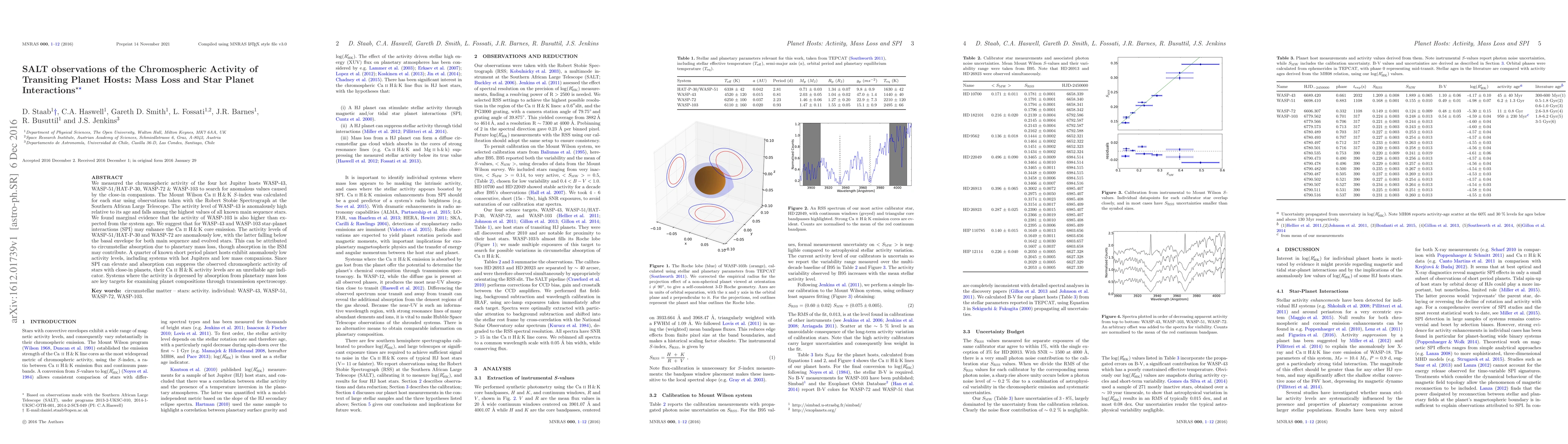 We measured the chromospheric activity of the four hot Jupiter hosts WASP-43, WASP-51/HAT-P-30, WASP-72 & WASP-103 to search for anomalous values caused by the close-in companions. The Mount Wilson Ca II H&K S-index was calculated for each star using observations taken with the Robert Stobie Spectrograph at the Southern African Large Telescope. The activity level of WASP-43 is anomalously high relative to its age and falls among the highest values of all known main sequence stars. We found marginal evidence that the activity of WASP-103 is also higher than expected from the system age. We suggest that for WASP-43 and WASP-103 star-planet interactions (SPI) may enhance the Ca II H&K core emission. The activity levels of WASP-51/HAT-P-30 and WASP-72 are anomalously low, with the latter falling below the basal envelope for both main sequence and evolved stars. This can be attributed to circumstellar absorption due to planetary mass loss, though absorption in the ISM may contribute. A quarter of known short period planet hosts exhibit anomalously low activity levels, including systems with hot Jupiters and low mass companions. Since SPI can elevate and absorption can suppress the observed chromospheric activity of stars with close-in planets, their Ca II H&K activity levels are an unreliable age indicator. Systems where the activity is depressed by absorption from planetary mass loss are key targets for examining planet compositions through transmission spectroscopy.