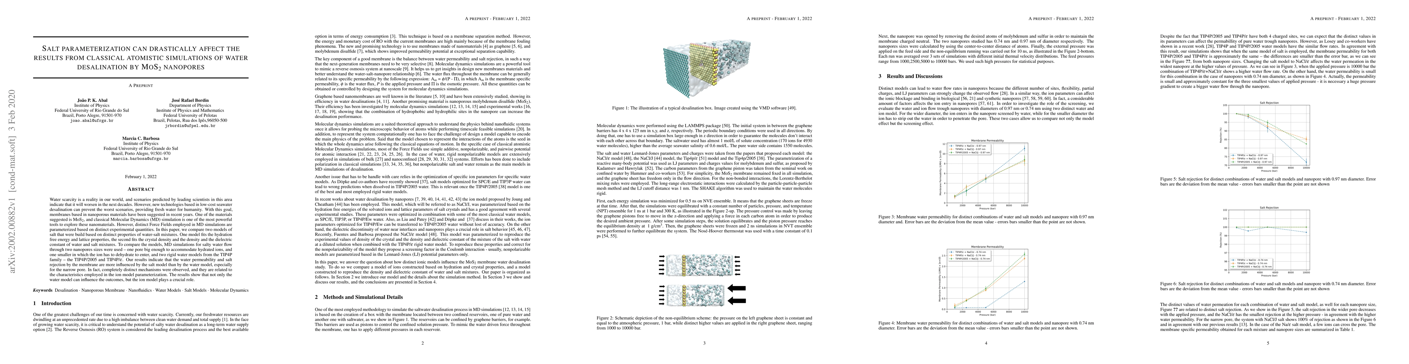 Water scarcity is a reality in our world, and scenarios predicted by leading scientists in this area indicate that it will worsen in the next decades. However, new technologies based in low-cost seawater desalination can prevent the worst scenarios, providing fresh water for humanity. With this goal, membranes based in nanoporous materials have been suggested in recent years. One of the materials suggested is MoS$_2$, and classical Molecular Dynamics (MD) simulation is one of the most powerful tools to explore these nanomaterials. However, distinct Force Fields employed in MD simulations are parameterized based on distinct experimental quantities. In this paper, we compare two models of salt that were build based on distinct properties of water-salt mixtures. One model fits the hydration free energy and lattice properties, the second fits the crystal density and the density and the dielectric constant of water and salt mixtures. To compare the models, MD simulations for salty water flow through two nanopores sizes were used -- one pore big enough to accommodate hydrated ions, and one smaller in which the ion has to dehydrate to enter, and two rigid water models from the TIP4P family -- the TIP4P/2005 and TIP4P/$\epsilon$. Our results indicate that the water permeability and salt rejection by the membrane are more influenced by the salt model than by the water model, especially for the narrow pore. In fact, completely distinct mechanisms were observed, and they are related to the characteristics employed in the ion model parameterization. The results show that not only the water model can influence the outcomes, but the ion model plays a crucial role.