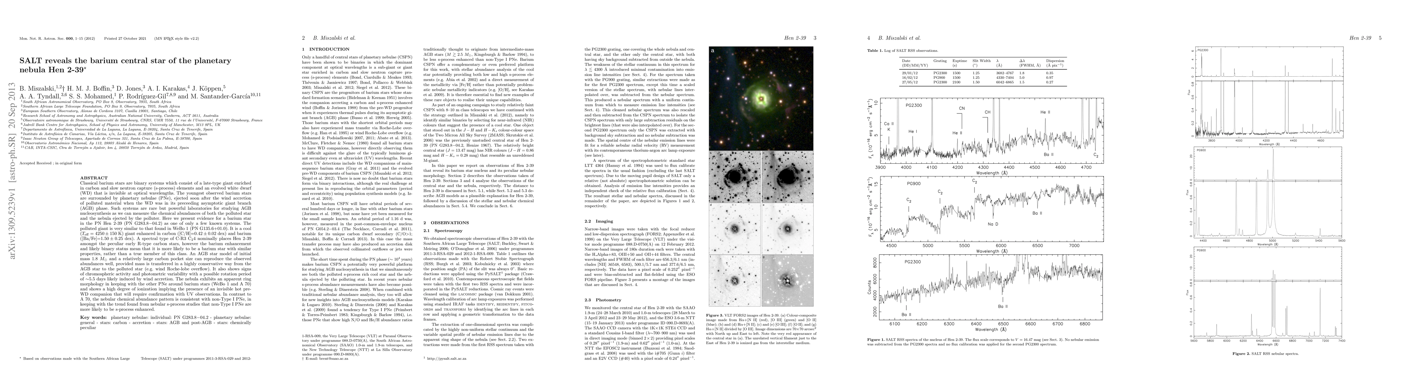 The SALT telescope has identified a barium central star in the planetary nebula Hen 2-39, revealing a rare binary system where a late-type giant star is enriched with carbon and barium, likely due to mass transfer from an invisible white dwarf companion. The nebula's ring morphology and high ionization suggest a hot pre-WD companion, with chemical abundances consistent with non-Type I PNe.