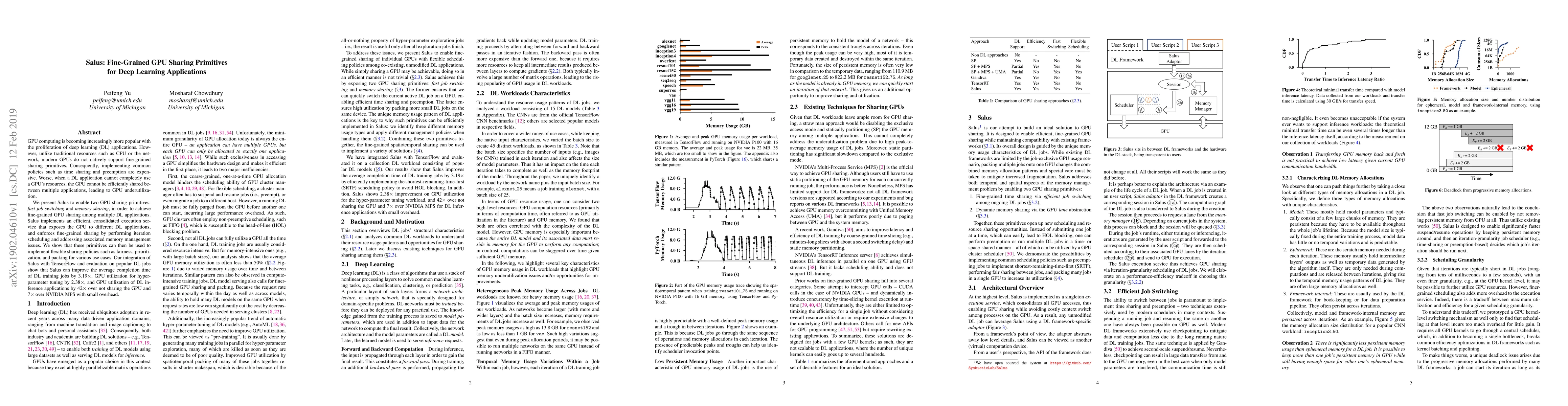 Salus introduces fine-grained GPU sharing primitives for deep learning applications, enabling efficient job switching and memory sharing to enhance resource utilization and reduce completion times. Evaluations demonstrate significant improvements in GPU utilization and job completion times compared to traditional sharing methods.