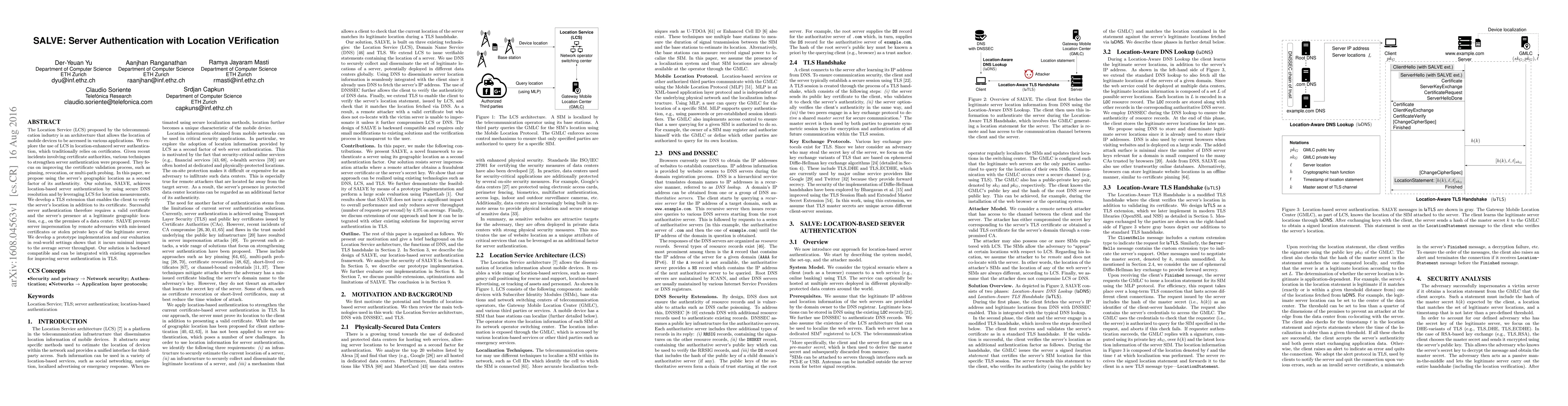 The paper proposes SALVE, a method for enhancing server authentication using the server's geographic location as a second factor, leveraging secure DNS and the Location Service (LCS) architecture. SALVE integrates a TLS extension to verify both server certificates and location, preventing impersonation by remote adversaries.