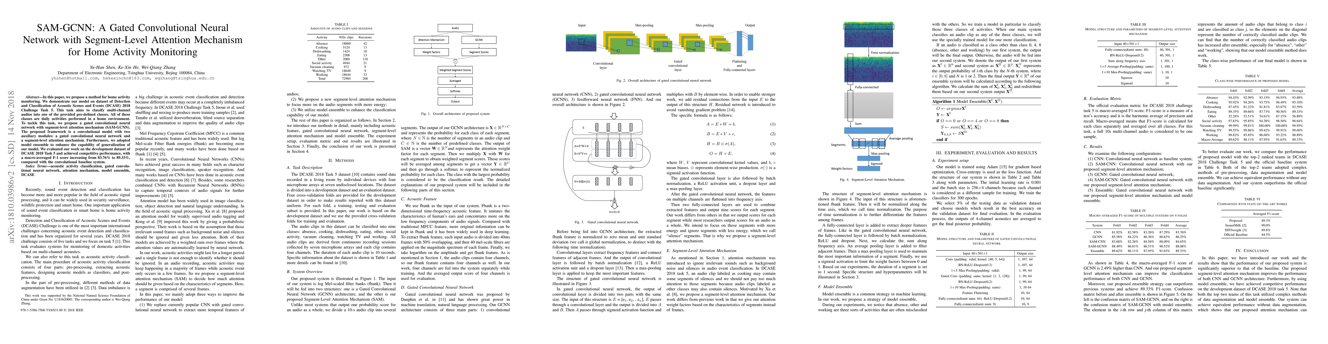 In this paper, we propose a method for home activity monitoring. We demonstrate our model on dataset of Detection and Classification of Acoustic Scenes and Events (DCASE) 2018 Challenge Task 5. This task aims to classify multi-channel audios into one of the provided pre-defined classes. All of these classes are daily activities performed in a home environment. To tackle this task, we propose a gated convolutional neural network with segment-level attention mechanism (SAM-GCNN). The proposed framework is a convolutional model with two auxiliary modules: a gated convolutional neural network and a segment-level attention mechanism. Furthermore, we adopted model ensemble to enhance the capability of generalization of our model. We evaluated our work on the development dataset of DCASE 2018 Task 5 and achieved competitive performance, with a macro-averaged F-1 score increasing from 83.76% to 89.33%, compared with the convolutional baseline system.