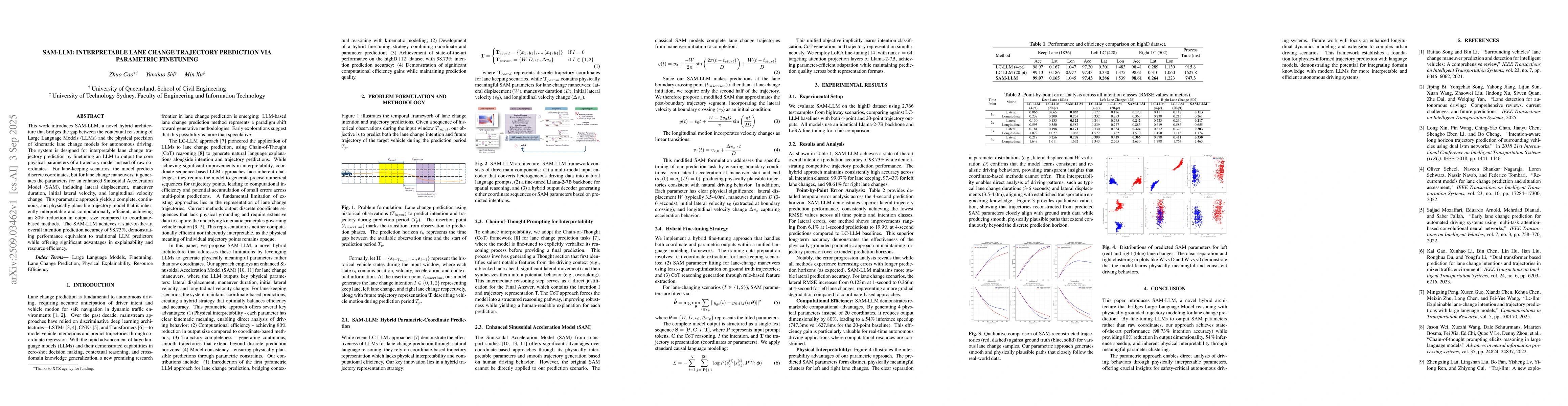 This work introduces SAM-LLM, a novel hybrid architecture that bridges the gap between the contextual reasoning of Large Language Models (LLMs) and the physical precision of kinematic lane change models for autonomous driving. The system is designed for interpretable lane change trajectory prediction by finetuning an LLM to output the core physical parameters of a trajectory model instead of raw coordinates. For lane-keeping scenarios, the model predicts discrete coordinates, but for lane change maneuvers, it generates the parameters for an enhanced Sinusoidal Acceleration Model (SAM), including lateral displacement, maneuver duration, initial lateral velocity, and longitudinal velocity change. This parametric approach yields a complete, continuous, and physically plausible trajectory model that is inherently interpretable and computationally efficient, achieving an 80% reduction in output size compared to coordinate-based methods. The SAM-LLM achieves a state-of-the-art overall intention prediction accuracy of 98.73%, demonstrating performance equivalent to traditional LLM predictors while offering significant advantages in explainability and resource efficiency.