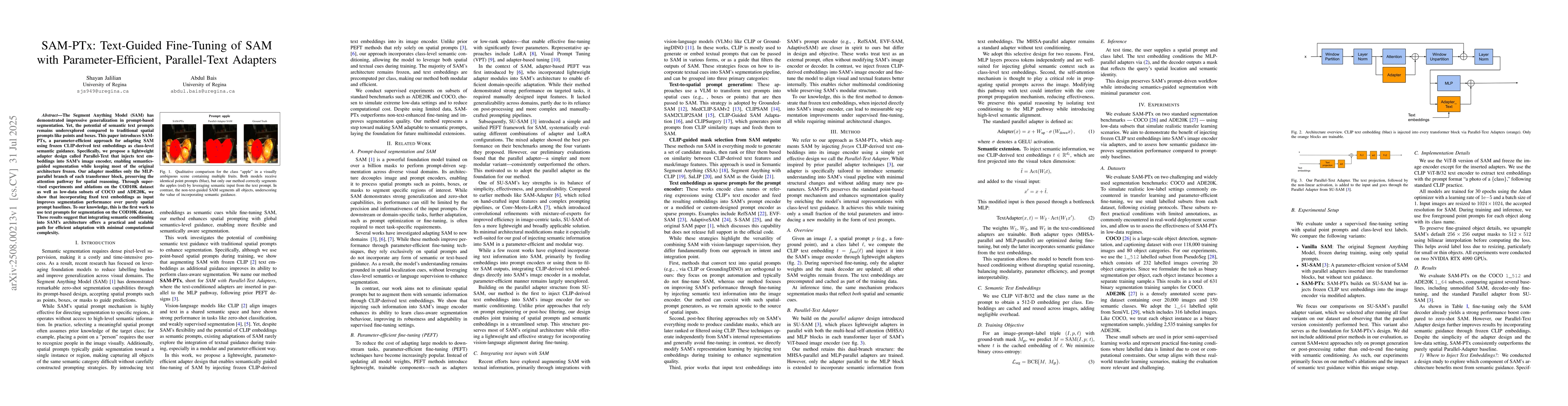 The Segment Anything Model (SAM) has demonstrated impressive generalization in prompt-based segmentation. Yet, the potential of semantic text prompts remains underexplored compared to traditional spatial prompts like points and boxes. This paper introduces SAM-PTx, a parameter-efficient approach for adapting SAM using frozen CLIP-derived text embeddings as class-level semantic guidance. Specifically, we propose a lightweight adapter design called Parallel-Text that injects text embeddings into SAM's image encoder, enabling semantics-guided segmentation while keeping most of the original architecture frozen. Our adapter modifies only the MLP-parallel branch of each transformer block, preserving the attention pathway for spatial reasoning. Through supervised experiments and ablations on the COD10K dataset as well as low-data subsets of COCO and ADE20K, we show that incorporating fixed text embeddings as input improves segmentation performance over purely spatial prompt baselines. To our knowledge, this is the first work to use text prompts for segmentation on the COD10K dataset. These results suggest that integrating semantic conditioning into SAM's architecture offers a practical and scalable path for efficient adaptation with minimal computational complexity.