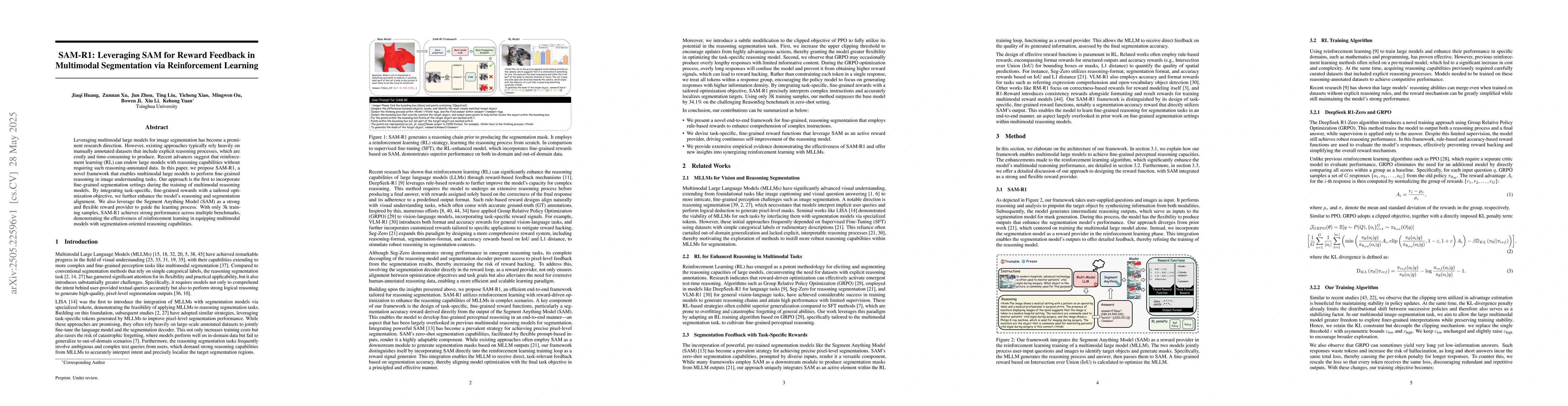 This paper proposes SAM-R1, a framework that uses reinforcement learning to enable multimodal large models to perform fine-grained reasoning in image understanding tasks, achieving strong performance with only 3k training samples.