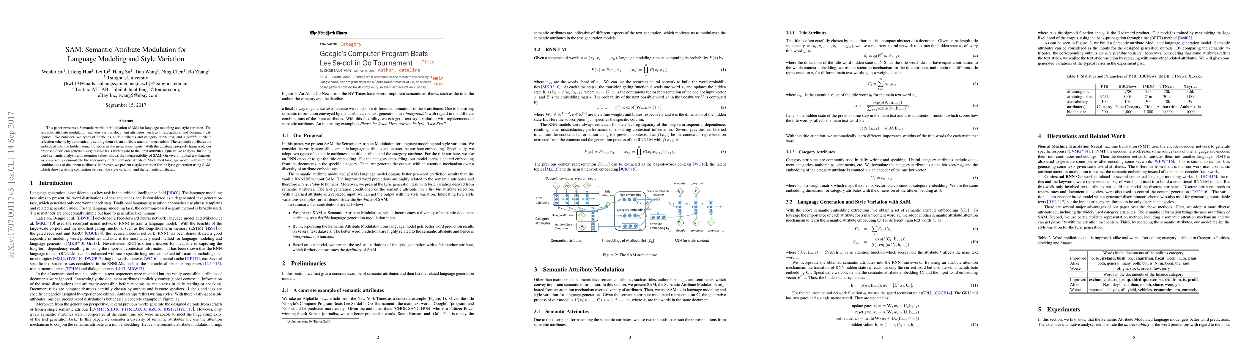 This paper presents a Semantic Attribute Modulation (SAM) for language modeling and style variation. The semantic attribute modulation includes various document attributes, such as titles, authors, and document categories. We consider two types of attributes, (title attributes and category attributes), and a flexible attribute selection scheme by automatically scoring them via an attribute attention mechanism. The semantic attributes are embedded into the hidden semantic space as the generation inputs. With the attributes properly harnessed, our proposed SAM can generate interpretable texts with regard to the input attributes. Qualitative analysis, including word semantic analysis and attention values, shows the interpretability of SAM. On several typical text datasets, we empirically demonstrate the superiority of the Semantic Attribute Modulated language model with different combinations of document attributes. Moreover, we present a style variation for the lyric generation using SAM, which shows a strong connection between the style variation and the semantic attributes.