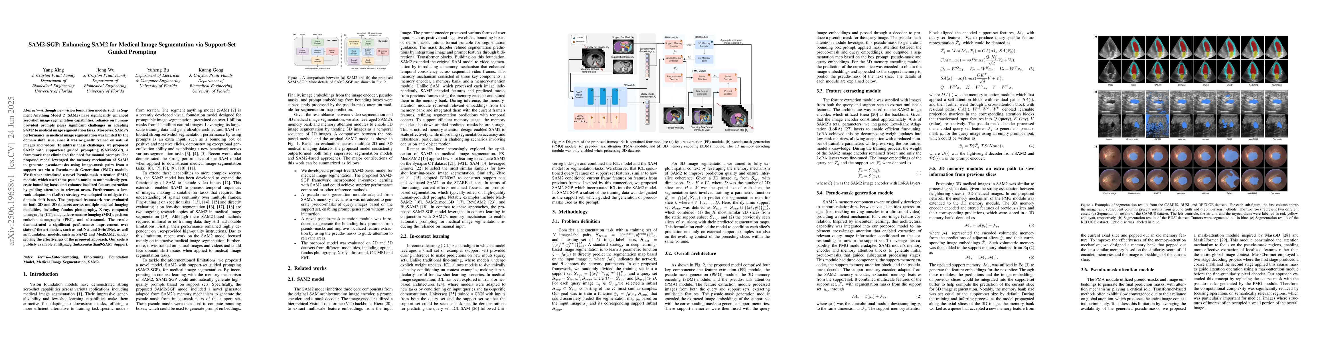 Although new vision foundation models such as Segment Anything Model 2 (SAM2) have significantly enhanced zero-shot image segmentation capabilities, reliance on human-provided prompts poses significant challenges in adapting SAM2 to medical image segmentation tasks. Moreover, SAM2's performance in medical image segmentation was limited by the domain shift issue, since it was originally trained on natural images and videos. To address these challenges, we proposed SAM2 with support-set guided prompting (SAM2-SGP), a framework that eliminated the need for manual prompts. The proposed model leveraged the memory mechanism of SAM2 to generate pseudo-masks using image-mask pairs from a support set via a Pseudo-mask Generation (PMG) module. We further introduced a novel Pseudo-mask Attention (PMA) module, which used these pseudo-masks to automatically generate bounding boxes and enhance localized feature extraction by guiding attention to relevant areas. Furthermore, a low-rank adaptation (LoRA) strategy was adopted to mitigate the domain shift issue. The proposed framework was evaluated on both 2D and 3D datasets across multiple medical imaging modalities, including fundus photography, X-ray, computed tomography (CT), magnetic resonance imaging (MRI), positron emission tomography (PET), and ultrasound. The results demonstrated a significant performance improvement over state-of-the-art models, such as nnUNet and SwinUNet, as well as foundation models, such as SAM2 and MedSAM2, underscoring the effectiveness of the proposed approach. Our code is publicly available at https://github.com/astlian9/SAM_Support.