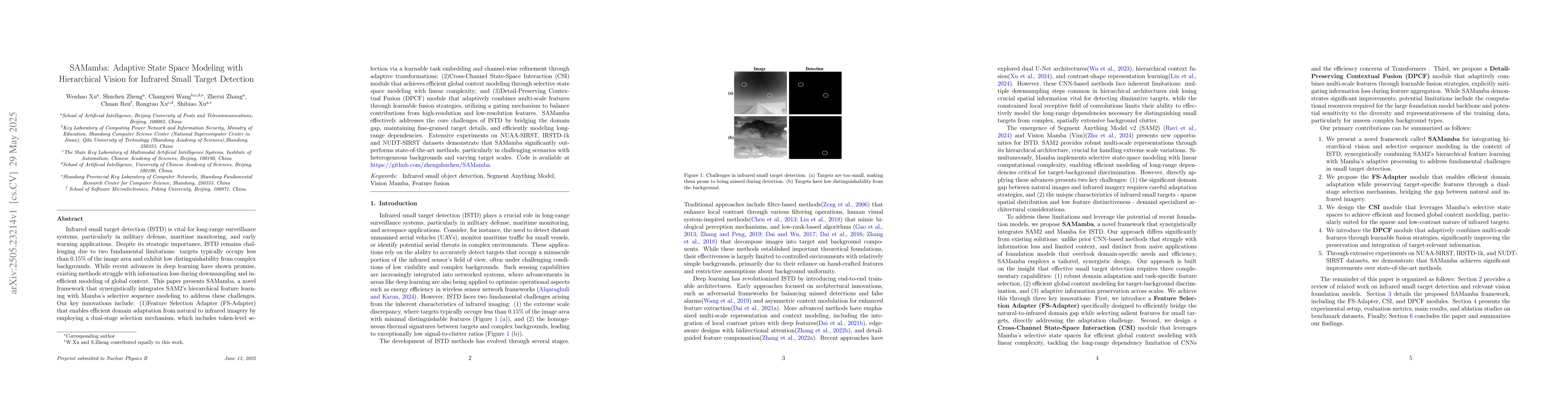 The paper presents SAMamba, a novel framework integrating SAM2's hierarchical feature learning with Mamba's selective sequence modeling for infrared small target detection (ISTD). It introduces a Feature Selection Adapter (FS-Adapter) for domain adaptation, a Cross-Channel State-Space Interaction (CSI) module for global context modeling, and a Detail-Preserving Contextual Fusion (DPCF) module for adaptive feature combination.