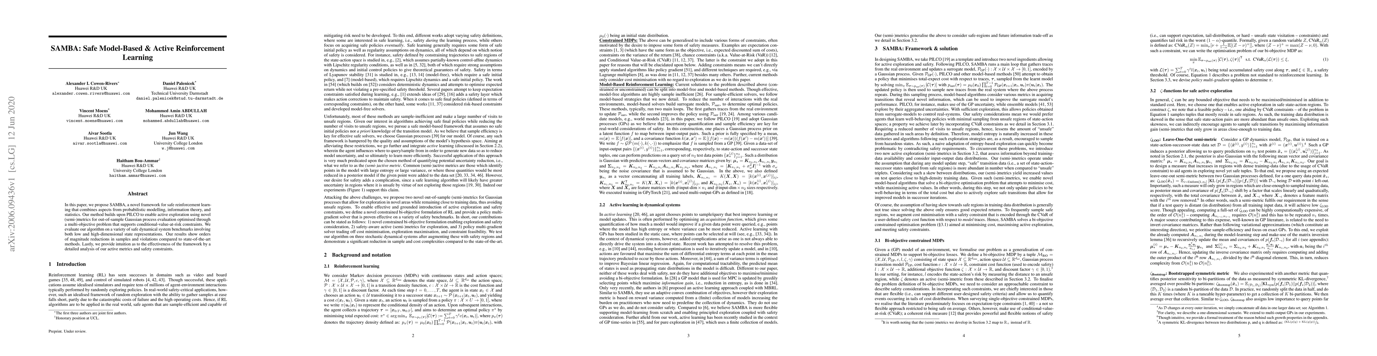 In this paper, we propose SAMBA, a novel framework for safe reinforcement learning that combines aspects from probabilistic modelling, information theory, and statistics. Our method builds upon PILCO to enable active exploration using novel(semi-)metrics for out-of-sample Gaussian process evaluation optimised through a multi-objective problem that supports conditional-value-at-risk constraints. We evaluate our algorithm on a variety of safe dynamical system benchmarks involving both low and high-dimensional state representations. Our results show orders of magnitude reductions in samples and violations compared to state-of-the-art methods. Lastly, we provide intuition as to the effectiveness of the framework by a detailed analysis of our active metrics and safety constraints.