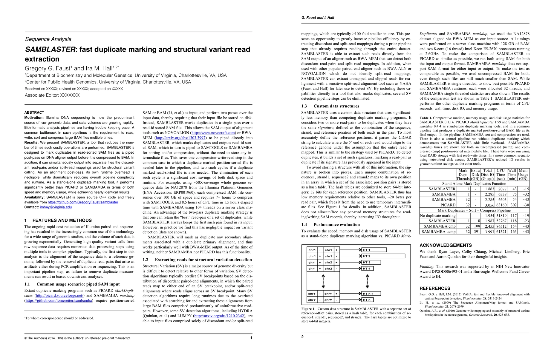 SAMBLASTER reduces pipeline complexity by marking duplicates in aligned data before compression, improving speed and memory usage over existing tools.